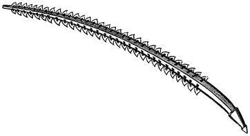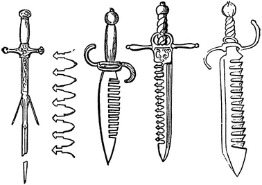 The offensive weapon of the sting-ray, and of various insects, as well as the teeth of all animals, man included, furnish models for serrated or saw-edged instruments. Hence Colonel A. Lane Fox observes:[40] ‘It is not surprising that the first efforts of mankind in the construction of trenchant instruments should so universally consist of teeth, or flint-flakes, arranged along the edge of staves.’ But evidently the knife preceded the saw, which is nothing but a knife-blade jagged. Other familiar instances would be the multibarb stings of insects, especially that of the common bee. Again, we have the mantis, an orthopter of the Temperates and the Tropics, whose fights, enjoyed by the Chinese, are compared with the duels of sabrers. For the rasping blow and parry they use the forearm, which carries rows of strong sharp spines; and a happy stroke beheads or bisects the antagonist. To this category belongs the armature of the saw-fish (Pristis), a shark widely 14distributed and haunting the arctic, temperate, and tropical seas. Its mode of offence is to spring high from the water and to fall upon the foe, not with the point, but with either edge of its formidable arm: the row of strong and trenchant barbs, set like teeth, cuts deeply into the whale’s flesh. Hence, in New Guinea, the serrated blade becomes a favourite Sword, the base of the snout being cut and rounded so as to form a handle.
