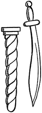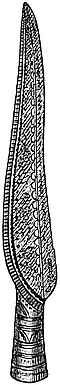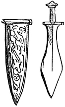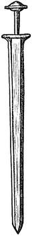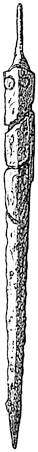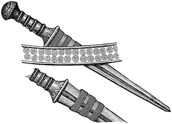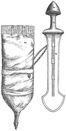 Iron Swords are rare: even in the second century b.c., when the Romans had given up the softer metal, the Gauls and Germans preserved it. This is especially noticed when Germanicus marched against Arminius, b.c. 15;[990] and as late as the days of Tacitus, Germany could not work the raw metal.[991] Remains of iron Spathæ have mostly been found in very bad condition; the material also is poor and badly made. The Held or champion used two kinds of blades; and the mètre-long two-edged German Sword is not to be distinguished from that of the Kelts. The Spatha was especially affected by three tribes: the Suardones (Sworders?), the Saxones (Daggermen)[992] and the Cherusci; in process of time it reached the Goths,[993] 272and at last wafan (weapon) applied only to the Sword. The blade (blat, blan, in Mid. Germ. valz), with its two edges (ecke, egge), was often leaf-shaped, as if copied directly from the bronze Sword. Others were smaller in the middle than at heft or point, for facility of unsheathing. The tang reached the pommel end, and the grip or hilt[994] was lined with wood (birch or beech), bone, and other material, covered with leather, fishskin, and cloth. There was no cross-bar, but the crescent extending over the shoulders, and serving to contain the rivets, was sometimes supplied with a guard-plate (die Leiste).[995] The weapon had a solid scabbard, often of iron, even when the blade was bronze, and was hung by riems or leathern straps to the warrior’s left.