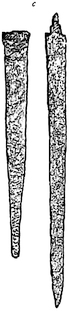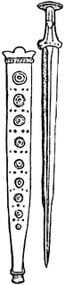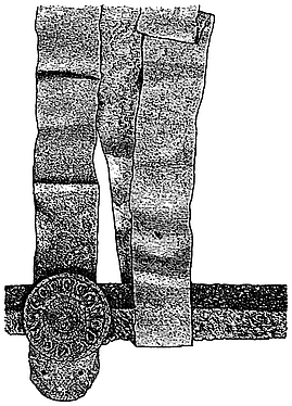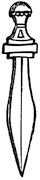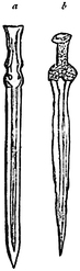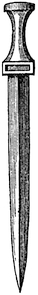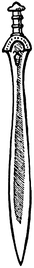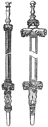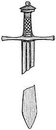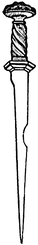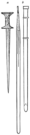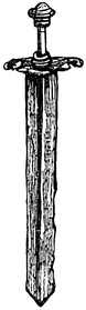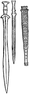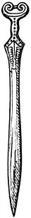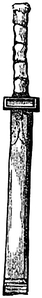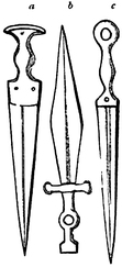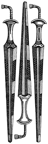During the Late Celtic Period the Britons, like the Gauls, were armed with gladii sine mucrone, which Tacitus[1040] calls ingentes and enormes, These Spathæ must have grown out of the bronze rapier. A monument found in London and preserved at Oxford shows the blade to have been between three and four feet long.[1041]
