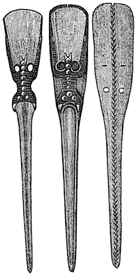 We have seen the rapier in Mycenæ and Etruria.[1037] It reappears in northern Europe, England, and France, perfectly shaped; and, though of rare occurrence in hoards, it seems to belong to the period when socketed celts were in use. There is no difficulty in tracing the intermediate steps between the leaf-shaped dagger and the rapier. The latter measures from twenty to twenty-three and a half, and even thirty and a quarter inches, with a breadth of five-eighths inch, widening at the base to two and three-eighths to two and nine-sixteenths inches. The largest have a strong projecting mid-rib, while their weight is diminished by flutings along either side. Another form of blade is more like a bayonet, showing a section nearly square; while a third has a flat surface where the mid-rib would be, a form not yet obsolete. Few are tanged;[1038] mostly we find the base or shoulders 279of the blade provided with drill-holes or with notches, to admit the nails; and in some the wings are broadened for this purpose.[1039]