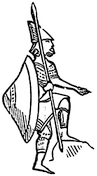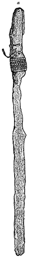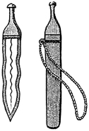 This would mean that after the weapon is thrown it might be drawn back again with a leather thong. Possibly the cateia of Isidore (cateia, to cut or mangle, and catan, to fight; the Irish caꞇ̇ and the Welsh kad, a fight or a corps of fighters, Latin caterva), survives in the tip-cat. In the Keltic dialect of Wales catai is a weapon.