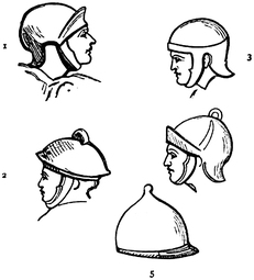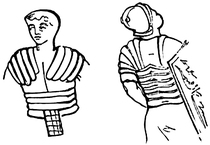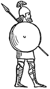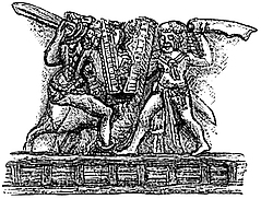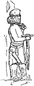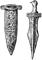 Plutarch[1006] describes the Cimbrian Sword as a large heavy knife-blade (μεγάλαις ἐχρώντο καὶ βαρείαις μαχαίραις), They had also battle-axes, and sharp, bright degans or daggers: the latter were highly prized, and their cuneiform shape caused them to be considered symbols of the deity,[1007] As usual amongst barbarians, the weapons of the chiefs had terrible names, so as to strike even the hearer with fear.[1008] Their defensive weapons were iron helmets, mail coats, and white glittering shields. Eccart holds that these arms and armour must have been taken from the foe: their barrows, in Holstein and elsewhere, having produced only stone-celts and spear-heads with a few copper Sword-blades, but no iron.