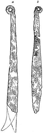 Dr. Evans[1019] assumes the total duration of the Bronze Period in Britain at between eight and ten centuries. He would divide this sum into three several stages,[1020] and 276to the last, which produced the bronze Sword, he assigns a minimum duration of four hundred to five hundred years. This was followed by the Early Iron Age, or later Keltic Period. The metal may have been used in southern Britain, peopled long before Cæsar’s time by immigrant Belgii, not later than the fourth or fifth century b.c., the approximate date of the earliest iron Swords in Gaul.[1021] Lastly, by the second or third century b.c. the exclusive use of bronze for cutting implements had practically ceased in Belgic Britain; the Roman historians do not lead us to suppose that the weapons, even of the northern Britons, were anything but iron.