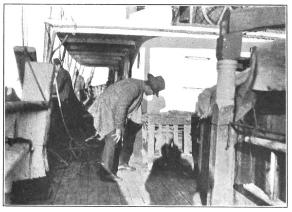 By ten o’clock I had two barges of coal alongside and a double crew at work passing baskets over the side and emptying them into the bunker holes in the deck. It was vile stuff that we were getting and the engineer fairly tore his hair as he saw the little better than dust being poured into his bunkers.