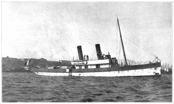 In the meantime I was entertaining a few friends in my saloon who had come out to say good-by. By four in the afternoon our refugees were all aboard and our papers duly received from the port officials. The sun had gone under a cloud and a stiff wind was blowing in from the sea as with anchor up, we swung around the end of the breakwater, with long blasts from our deep-toned foghorn as a farewell to friends ashore. The flag on the American Consulate was dipped and some enthusiast on the roof let go both barrels of a shotgun, to which we replied by bending our own ensign. In fifteen minutes we were at sea and the top of the Greek Church, the only sign left to us of the little town, to which it had been the first to welcome us from the storm a few days before.