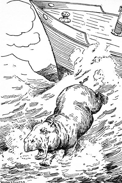 One day, when Chunky didn’t have any name, nor his brother or sister either, a great, big, fat hippo mother came over to see Mrs. Hippo. The visitor, whose name was Mrs. Dippo, as we might say, because she liked to dip herself under the water so much—this Mrs. Dippo said, talking hippopotamus talk of course: