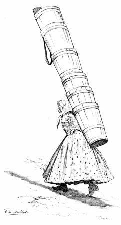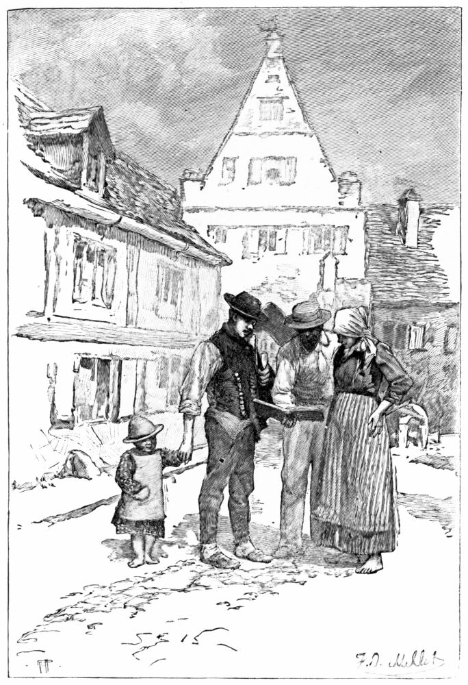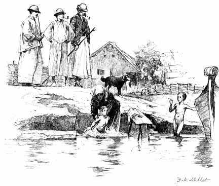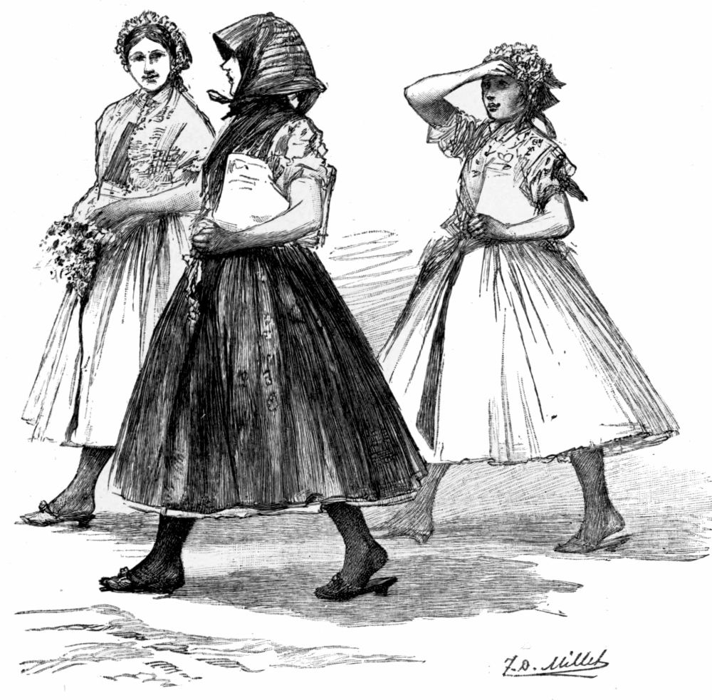The quaintest and strangest of costumes met our eyes as we leaned out of the window of our compartment when the train stopped at the station of St. Georgen, eager to see how the brook had widened there. The hurrying peasant women, in queer skull-caps with immense ribbon bows, stiff bodices, and short petticoats, seemed to be the supernumeraries in the prologue of an exciting, drama now about to begin. The train rolled slowly on with that peculiar settling-down motion that denotes a descending grade, and we watched the yard-wide brook gradually expand its channel and assume the proportions of a goodly stream. In the fertile valley near Villingen, where the country opens out{5}