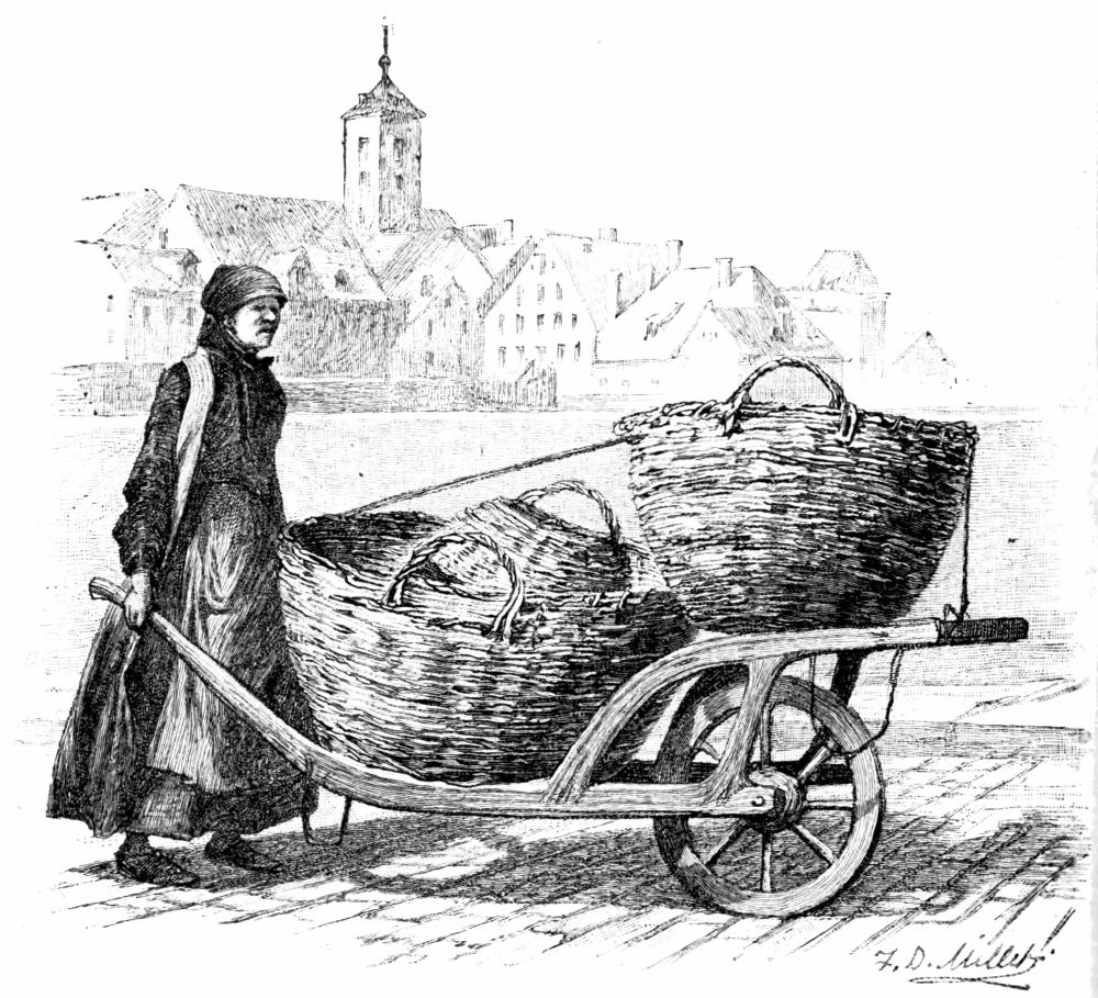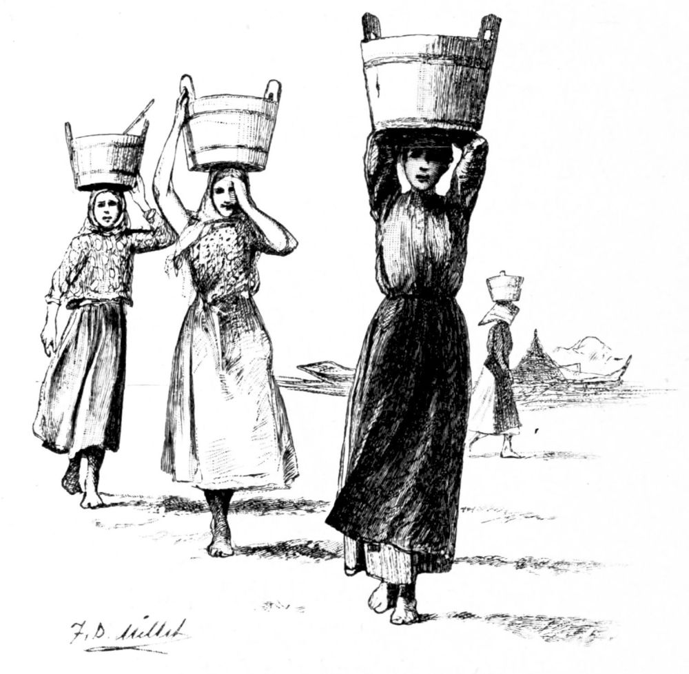 a sketch-book—and, furthermore, we must promise not to sketch anything before we would be allowed to go into the village. Seeing the place even with this restriction was better than dangling our heels from the edge of the quay all the afternoon, and we accepted the invitation of one of the fish merchants to drink tea with him, and strolled off into the village.