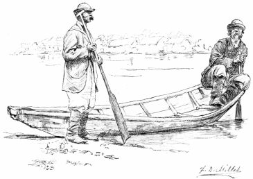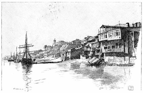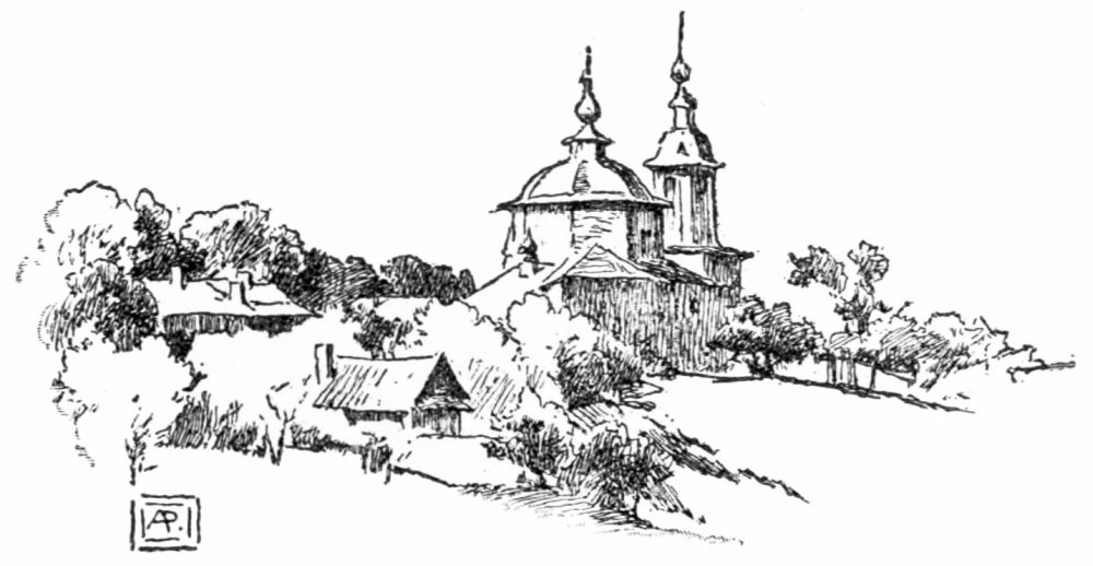 A hospitable-looking bath-house moored near the landing offered us a familiar refuge at Ismail, and we innocently put in there and prepared to go ashore. Before we had left the canoes, however, a fussy Custom-house guard with a short sword by his side came hurrying up, and peremptorily ordered us to cast off our painters and to land on a little beach about fifteen yards farther down-stream. We assured him we had the permission of the bath-house keeper to moor our canoes where we were, but he failed to see any point in this remark, and the more we demurred the more aggressive he became. Reinforcements now began to arrive and we thought best to yield, and consequently went ashore at the spot indicated. Just above, on the{300} bank, was a rambling wooden structure, offensively ornamental in style, somewhat resembling a sea-side villa. We were conducted into this building by our fuming guard and found it was the Custom-house of the port, although there was no sign nor flag to suggest this fact. Entering a small room, our passports were examined and stamped by a courteous official and given back to us again. Understanding that we were now free to go into the town, we returned to the canoes, took them up to the bath-house again, and, carrying our sketching materials, started to walk out through the enclosure in which the Custom-house was situated. We were not allowed to pass with our sketch-bags, and were conducted to the Custom-house to have them examined. Of course nothing dutiable was discovered in them, but we were told that we would not be allowed to carry them into the town until the chief of the customs had given us permission, and he was not expected at the office for an hour or more. There was nothing left for us but to wander off up the long street to see if there was anything worth sketching. It was an extremely hot day and the streets were dusty, unshaded by trees, and often almost impassable by reason of deep gullies and broken culverts. The town is laid out in rectangles, and most of the houses are long and low, and built of bricks or mud plastered on the outside; a few of them, however, are made of unpainted, skilfully-hewn logs. There are several large buildings on one side of the vast, empty square opposite the great white church with several green domes which rises high above the stunted trees and adjacent houses, but with these exceptions the street architecture, as far as we saw it, is of the plainest and least attractive kind.
