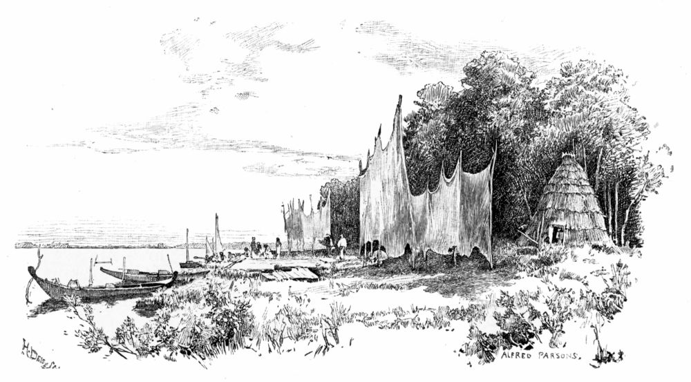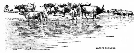 The following morning we were on our feet at dawn, eager to see what sort of country we had reached in the darkness. We found that we were at the “cordon,” or one of the Roumanian customs picket posts, on a point of land called Cape Masoura, and that we had come out into the Black Sea through that branch of the river called the Zaliv. The bay we had crossed in the twilight was an ancient mouth of the river, not navigable within the memory of man. Our camp was on the edge of a broad, rough meadow,{326} bordered on the north by great shallows where the sea is eating into the land, and extending for miles to the southward, where a range of sand-dunes hides Sulina from view, and to the west towards dark masses of the great forest on a low, sandy elevation which marks the line of the ancient sea-coast. The whole tract as far as we could see was gay with wild-flowers. In Alfred Parsons’ note-book are enumerated among the plants found on this sandy flat, sea-lavender (Stalice latifolia), small Michaelmas daisy, just coming into blossom, large-leaved meconopsis, mauve lactuca, and several yellow composite flowers. In the lakes of the delta among the reeds he found water-lilies, villarsia, frogbit, a floating plant like a yucca, with thorny edges to the leaves, a sort of duck-weed with rough primate leaves, and on the river-banks, loosestrife, hemp, agrimony, flowering rush, and a thick undergrowth of marsh fern.