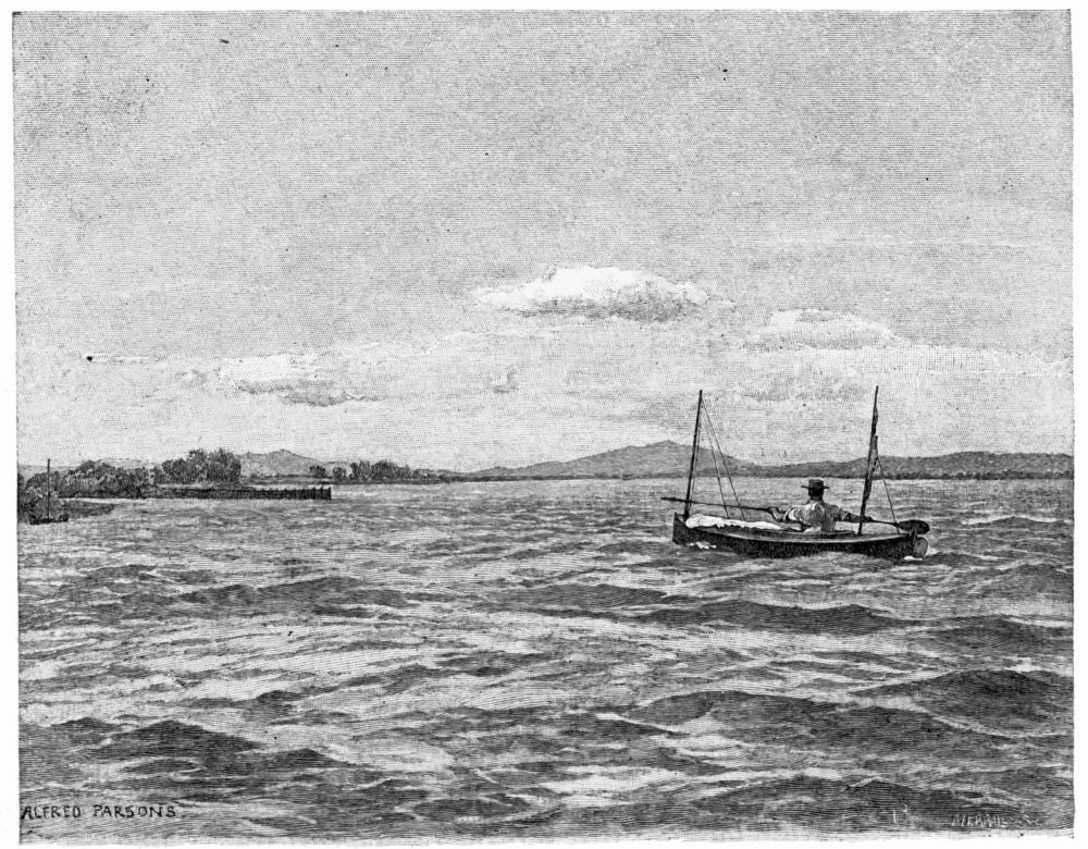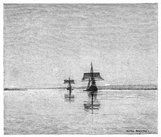 In an hour and a half the stream curved round to the south east, and we were enabled to take advantage of the wind and hoisted sail at once. Just as the sun was setting we came into a short reach, scarcely wider than the Danube at Donaueschingen, and there, in front of us, was the straight line of the sea-horizon stretching across between two low, reed-covered points. In a few moments more we sailed out gayly into the Black Sea. The broad open expanse of the sea was before us, all yellow and glowing with the reflection of the gorgeous sunset sky, and the light on the jetty at Sulina glimmered brightly in the distance. But we could see neither beach nor sand-dunes, and for a long distance in front of us and on either side, as far as we could distinguish in the dim light, stumps of trees, ugly snags, and bunches of reeds were sticking up out of the water. No possible camp-ground was visible anywhere, and for a moment we scarcely knew what to do or which way to turn{323}