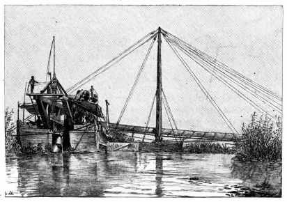 After a short paddle down a pleasant reach under perpendicular bluffs on the Russian shore, past frequent irrigating machines ingeniously constructed to lift the water upon the high plateau, we came out into a perfectly flat country partly wooded on either side. The strong north-east wind which had been blowing almost continuously for days gave us no rest, and raised a choppy sea which seriously checked our speed. About ten miles below Ismail the river divides into three parts, which join into one stream at Kilia fifteen miles farther on. We planned to camp somewhere above the latter town, and chose the central passage as probably the most direct one. For the rest of the afternoon we worked steadily, expecting to come in sight of Kilia long{306} before sunset. A swampy wilderness surrounded us, and not a yard of solid earth did we see. The frontier runs along the northerly limit of the delta on the banks of the smallest of the three lesser arms just described, and we therefore did not even have the company of the picket stations. Indeed, the only human habitations we came across were at a fishing-camp, where several rude huts were scattered about among the reeds and willows, their mud-floors scarcely a foot above the level of the water. It began to rain, and heavy storm-clouds, driven by the rising gale, swept over the whole sky. The sun went down and we had left the region of willows, and now saw nothing but reeds on all sides of us. Soon the gathering twilight drove us to seek a camp, although the domes of Kilia were not yet in sight. The only place we could find after a long search was a small clearing among the reeds on the left bank, where some fisherman had dried the stalks for floats to his nets. Here we hauled up the canoes, settled them firmly in the soft mud of the marsh, bow to bow, at an angle with each other, and, spreading a thick layer of freshly-cut reeds over the triangular space between the canoes and the edge of the bank, put up our tents and built a fire. The latter operation was not so easy as it sounds, for all the wood we could find was the water-soaked branches of willow which we broke from the snags or pulled out of the ooze of the banks. We were, however, prepared for just such an emergency and, lighting an ordinary little wire-gauze spirit-lamp, arranged the smallest twigs over the frame so they soon dried, then caught fire, and by their heat dried others, until we shortly had enough strength of flame to kindle the large pieces of sodden wood. Sheltered from the rain by our sketching umbrellas in the lee of the canoe tents, we cooked an elaborate dinner of several courses, and enjoyed as comfortable a meal as if our camp had been made on{307} the sound turf of an English meadow. As for our snug beds, they were quite as dry and warm as at any other bivouac, notwithstanding the fact that the canoes were lying in a slough of black mire.