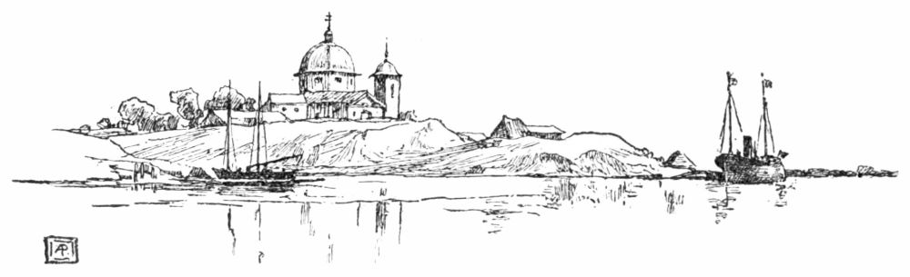 The houses are low and solidly built, and most of them have one peculiar feature—a row of columns in front, supporting a projection of the roof. They stand closely together along straight thoroughfares which are little better than canals of mud, being only a few inches above the level of the river. The foundations of the houses are raised a foot or two above these sloughs, and roughly-hewn plank sidewalks, supported by piles, extend everywhere in front of the buildings, even into the narrow side alleys where fishermen’s huts are huddled together in the marsh among reeds and willows. Two great white churches, enclosed by neat palings, occupy the middle of wide, neglected squares, and look bleak and bare and uninviting. The house we visited was of one story, but long and deep, and was comfortably, even luxuriously, furnished. The drawing-room, where we took unlimited tea and sweets, after the Russian custom, might have been in Vienna or Bucharest, with its parquet floor and ornate furniture.