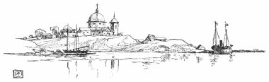 The sight of two large documents, quite unlike anything called passports he had ever before seen, only added to his distress, and he looked at them with much the expression of a man who sees the warrant for his arrest in the hands of a sheriff. At this juncture two young men came up, introduced themselves to us as fish merchants of the place, interceded in our behalf, and succeeded in calming the old man’s excitement so that he looked at the visés on our passports and told us to come ashore. After further discussion he consented to register and stamp our papers, but refused to give them back to us, saying we could have them again when we went away. All the arguments we could invent were eloquently used in the hope of persuading him to permit us to land our sketching materials, and our two young allies, who had been educated in Odessa and understood our position, joined their voices to ours, but all in vain. Not an article must be removed from the canoes—not even{315}