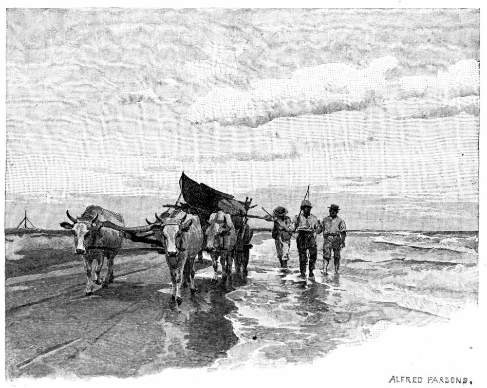 shore, and we could see the white water on the bar beyond the light-house. We paddled on for several miles in the trough of the sea, dodging the waves and escaping capsize only by careful steering. We thought it useless to venture out into the roadstead, but kept along near the shore, and when we found the waves were rising to a height which made further advance foolhardy, we ran the canoes ashore through the surf and hauled them up on the beach just under the sand-dunes—the ideal camp-ground of our imaginations. We were not in sight of any house, and as we could not paddle any farther, it looked as if we might enjoy our sea-shore camp after all. However, on reconnoitring from the top of one of the dunes, we saw an ox-cart slowly moving across the meadow a half-mile or more away, and ran and overtook it. The driver was a fine, tall young Roumanian farmer, with an intelligent, handsome face, and he consented to carry the canoes to the Sulina branch for us. He had an excellent cart and two yoke of oxen, and there was an easy road along the hard beach. On the firm white sand, under a brilliant noonday sun, and in full view of the great blue expanse of the Black Sea, we dismantled the canoes and lashed them on the ox-cart, one above the other. After a couple of hours’ walk along the beach in the very wash of the waves, we came to the north bank of the Sulina arm opposite the town. Here we slid the canoes into the stream, took our last paddle across the Danube, and deposited them in the warehouse of a hospitable friend to await shipment to England. We then and there compared notes, and agreed we had only two things to regret in our whole trip: one that we did not launch the canoes at Villingen, fifteen miles above Donaueschingen, and the other that we did not have our camp on the sands of the Black Sea.