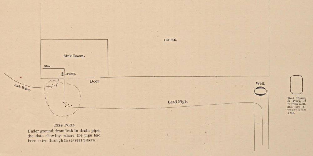 By the diagram sent, you will see that the well is under the L part of the house. The water is drawn up by means of a windlass in one of the back rooms. The well itself is some twenty-five feet deep. In the summer kitchen, not more than three or four feet from the well, you will notice the sink marked 2 on the diagram, which discharges its water on the ground by means of an open spout but a few feet from the outside of the building. At 3, about an equal distance from the well, is a back door, from which foul water, as on washing-days, and filth of nearly all descriptions, were usually thrown, which is not saying more than can be said of back doors to farm-houses in general.