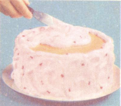 1 Use Betty Crocker Fluffy White Frosting Mix, saving 1 cup for Decorator Icing (p. 9). Tint rest pale yellow and frost cake.