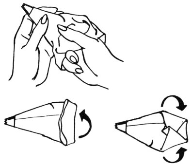 1 Fit tip tightly into cone with one finger. Fill about half full. Fold top to keep icing in.