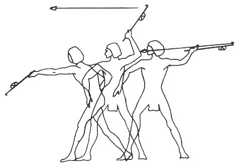 An atlatl was made from a flattish, two-foot long piece of wood and was used as a spear-thrower. It had a hook, made of bone or antler, attached on one end and a hand grip carved on the other end. A stone, clay, or shell weight was sometimes attached toward the hooked end to increase the force of the throw, or perhaps only for decoration. A spear was rested on the atlatl with the end of the spear shaft inserted into the atlatl hook. The hunter held the atlatl grip and the middle of the spear in the same hand, then he hurled the spear from the atlatl (see cover illustration). The atlatl acted as an extension of his arm, giving extra power and accuracy to the throw.