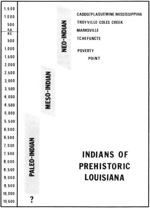 Much of Canada was covered with ice during this time, but periodically, ice-free corridors of land connected Alaska with the Great Plains of the United States. Over hundreds of generations nomadic people spread throughout southern North America, Central America, and South America. At least by 12,000 years ago, the first Indians lived in the southeastern United States. The prehistoric era in Louisiana begins with these first inhabitants and concludes with the arrival of the Europeans. The chart at the left outlines the long, rich prehistory of Louisiana.