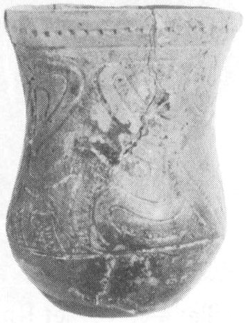 The new Marksville pottery was made from local clay, but it was quite similar in shape and decoration to pottery of the Hopewell Culture in Illinois and Ohio. A typical Hopewell vessel would be a bowl three to six inches tall. The rim would have cross-hatched lines on the exterior at the top and the design on the rest of the pot would be outlined with bold lines cut in the clay. Quite often the 20 designs were geometric shapes and stylized birds. The background would be textured by rocking or stamping a small, toothed tool across the wet clay. These decorated pots were made primarily for ceremonial uses.