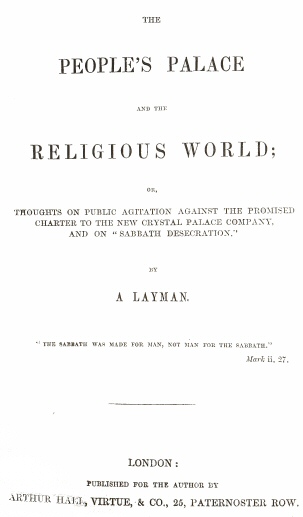 Briefly to recapitulate the foregoing facts and arguments:—The Crystal Palace Company is a private speculation, not a public institution. They propose to open only their grounds and winter-garden on Sunday, and that but for half the day. This place of recreation, therefore, stands on much the same footing as Richmond or any other p. 14public park—being accessible to the masses by no other means than a conveyance—differing only in providing refreshment (exclusive of spirituous liquors) to its frequenters. It is untrue to assert that a Royal Charter will enable the Company to open their grounds—for the right exists independent of the Charter. Government, therefore, cannot be said to sanction “the desecration of the Sabbath”—being unable to prevent it. The State has no right to refuse a privilege on religious grounds, seeing that it is a purely civil institution, and bound to secure entire liberty of conscience; which is inconsistent with partiality to the views of any sect. To spend the Sabbath as a day of recreation does not clash with its definition as “a civil institution.” In exacting the shutting-up of the Sydenham grounds, Government would be acting inequitably, for other and worse pleasure-gardens are open on Sunday—inconsistently, for the grounds of Hampton Court Palace, which are national property, have been for some years accessible to the people with their express sanction. It would not, therefore, be a precedent for “the desecration of the Sabbath.” If the Crystal Palace is closed on that day by authority, all other places of recreation must be closed also—for you cannot have partial legislation on the subject. Such a general measure would be highly unjust and injurious, besides being impracticable. The much-deprecated event would not be likely to increase the irreligion or immorality of the people; for, although some few might be led to desert places of worship and neglect Sabbath privileges, by the superior attractions of the Sydenham Palace, many more would substitute its pleasures for those of a less elevating character, offered without restriction elsewhere; while the bulk of those who frequented it would not, in all probability, if it were entirely closed, “keep the Sabbath” in the sense of these alarmists. The day of rest can only be a period of spiritual profit to those who value it for that purpose. To impose its religious observances upon those who do not, is to promote hypocrisy, not piety. For the religious world, confessedly a minority, to seek to impose, by State interference, their notions of what constitutes a day of rest upon the bulk of their fellow-countrymen, is intolerant—an act of coercion at variance with the first principles of Christianity. There is good reason for believing that the cause of morality, and therefore of religion, will, with the present tendencies of the metropolitan working-classes, decidedly gain by the opening of the Sydenham pleasure-grounds. It will be no more harmful than free access to the Parks. It will not rob the poor of their “day of rest,” because it is quite optional with them p. 15to go there; and, while they act as free agents, it may be presumed, that they spend the day as best suits their inclinations.