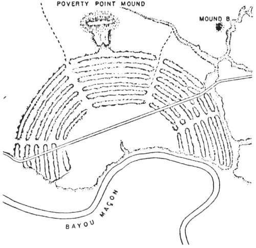 In northeastern Louisiana by 1000 B.C., Indians had built rows of earthen ridges three-quarters of a mile across. As far as we know, they are the earliest earthworks of their size in North America. Some archaeologists think they were constructed as an astronomical observatory because two gaps in the ridges line up with the winter and summer solstice sunsets.