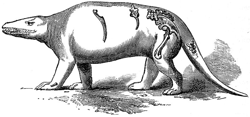There are some very rare and remarkable extinct animals of which only the fossil skull and a few detached bones of the skeleton have been discovered: in most of these the restoration has been limited to the head, as, for example, in the case of the Mosasaurus; and only in two instances—those, viz., of the Labyrinthodon and Dicynodon—has Mr. Hawkins taken upon himself the responsibility of adding the trunk to the known characters of the head, such addition having been made to illustrate the general affinities and nature of the fossil, and the kind of limbs required to produce the impressions of the footprints, where these have been detected and preserved in the petrified sands of the ancient sea-shores trodden by these strange forms of the Reptilian class.