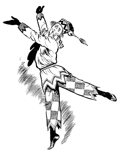 Lacking the initiative, the constructive power, which full intelligence alone can give, Pétrouchka can yet perceive his shortcomings. He passes himself in review, and finds satisfaction in{24} nothing. His motions, gestures—who could admire such awkward angularity, such jerky, jumpy movements? Thus he reflects dolefully, as he strives experimentally to move his limbs with easy grace and rhythm. As to his clothes, such gaudy, parti-coloured gear is fit only for buffoons and clownish oafs, not for one who possesses (in how limited degree, poor fellow! he does not realise) the finer instincts. His motley shames him, his involuntary gaucherie moves him to anger with himself. Nothing is right; and with a travesty of emotion which excites a smile while it moves to pity, Pétrouchka abandons himself to despair.
