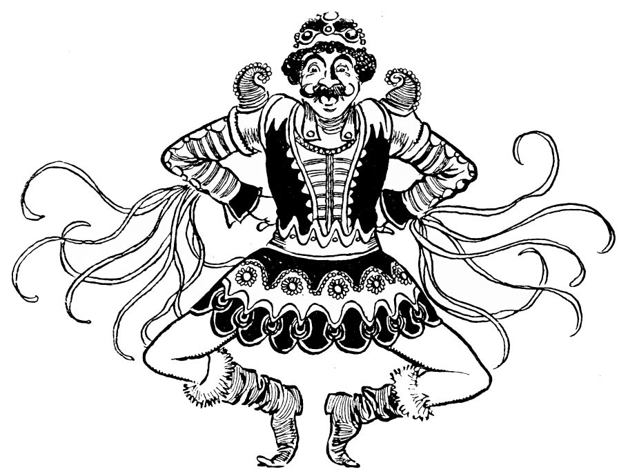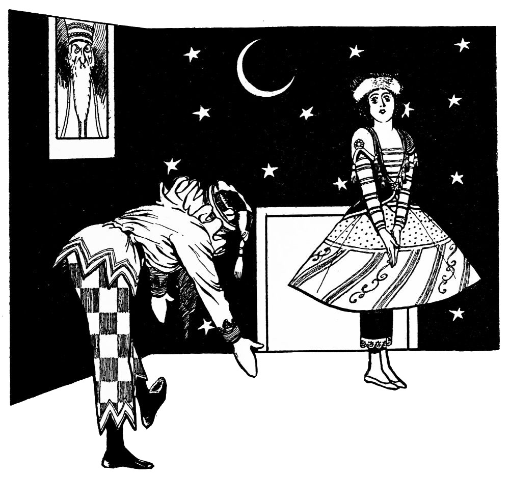 Indolent and stupid, the rival of Pétrouchka is happier than he. Less responsive to the showman’s baneful influence, the swarthy doll{26} has been invested with but little more than the lowest of human appetites and instincts. No dim perceptions of romance are his; his brutish wits have not been sharpened, like Pétrouchka’s, to the point of suffering. Lolling in his gaudy chamber, he passes the time in idleness and folly.