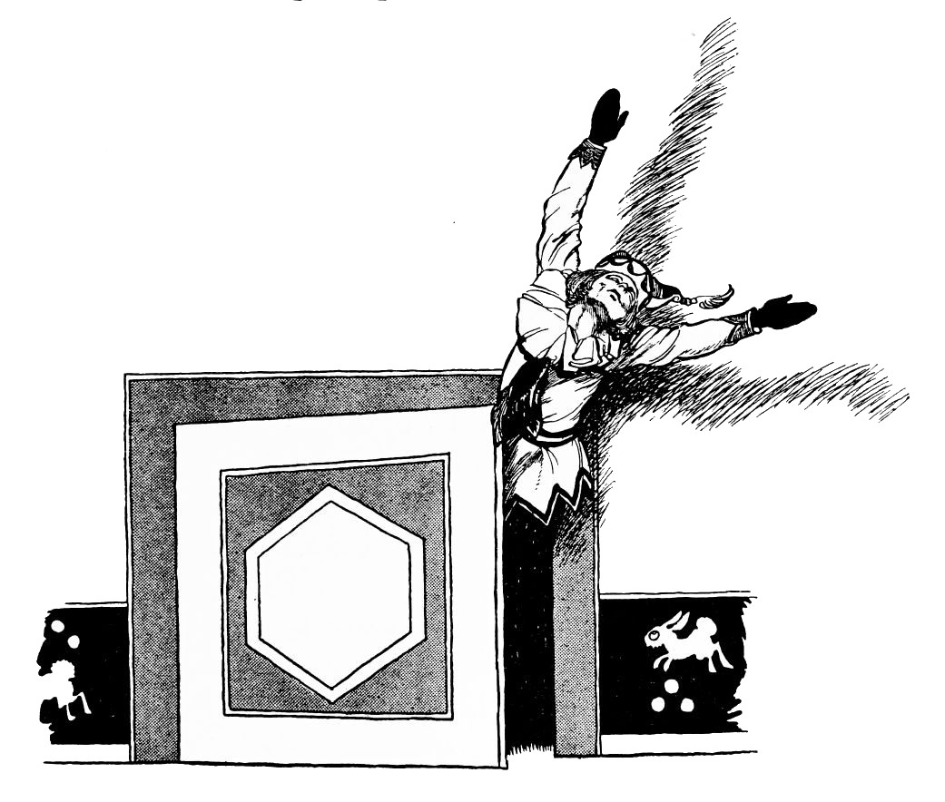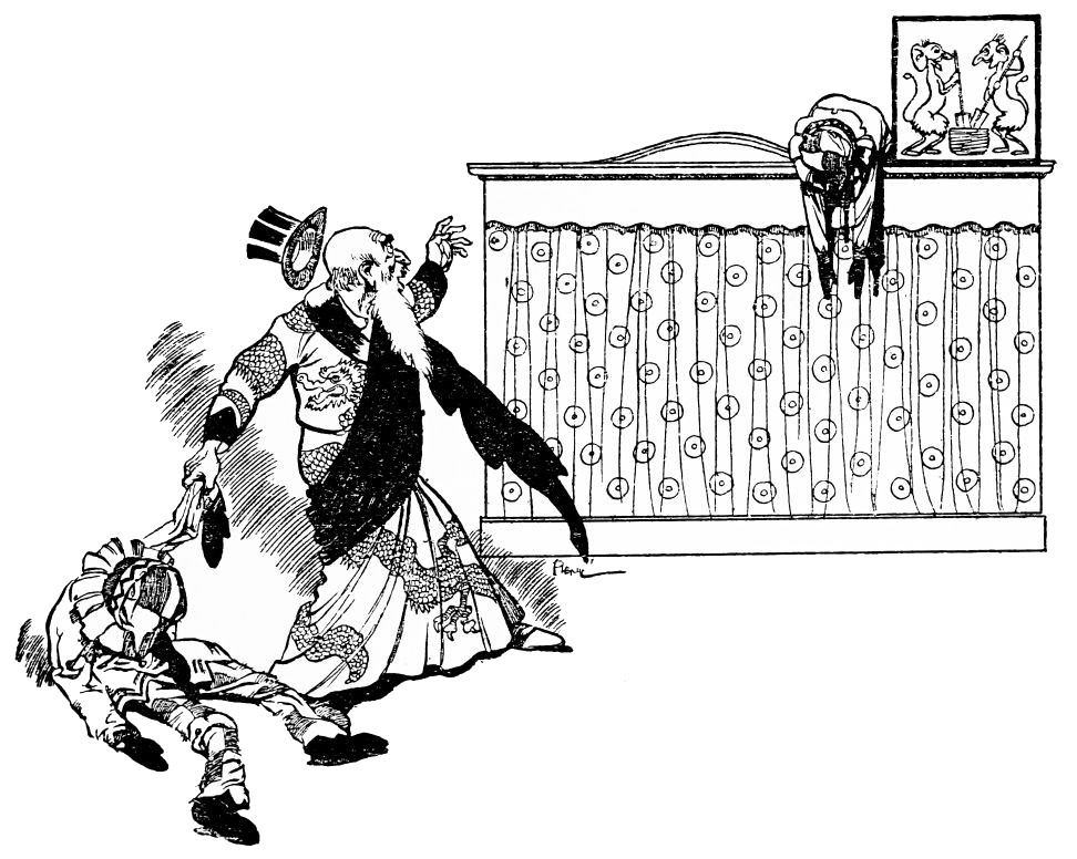 With gestures odd and unexpected the strange old man pipes forth a tune upon his flute—a jerky little air to which he jerkily sways and twists his lank body. The gaping onlookers follow his antics with half-mesmerised gaze, and when presently he takes the flute from his lips and steps down to the front of the booth they are all agog to learn what sequel to this prelude the drawn curtains will reveal.{20}