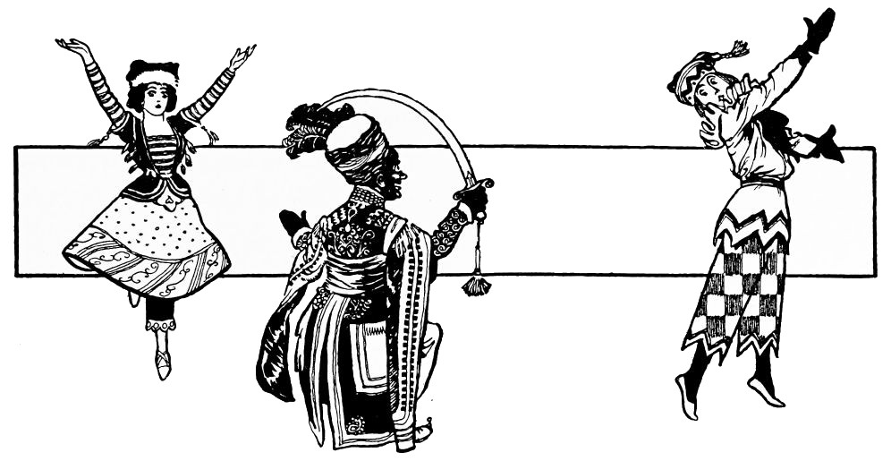 This lapse of the ballet into desuetude accounts very largely for the extraordinary success of the Russians, who burst dazzlingly upon the gaze of a listless public, and demonstrated that ballet, which had come to be synonymous with banality, could be made both a forceful and a beautiful vehicle of artistic expression. There had been forerunners of the “Russian invasion”—brief appearances of one or two of the most distinguished dancers in isolated performances at a London variety theatre; but it was not until the complete Russian Ballet, as organised by M. Serge de Diaghilev, made its bow, en grande{5} tenue, at the Covent Garden Opera House, that the London public awoke to recognition. The descriptive power of music it knew, “wordless plays” were not unfamiliar, pas seuls and pas de deux it had seen performed in countless number by accomplished dancers of every nationality and style. But the art of the ballet, which combines music, pantomime and the dance, was a revelation, and its enthusiasm was great.