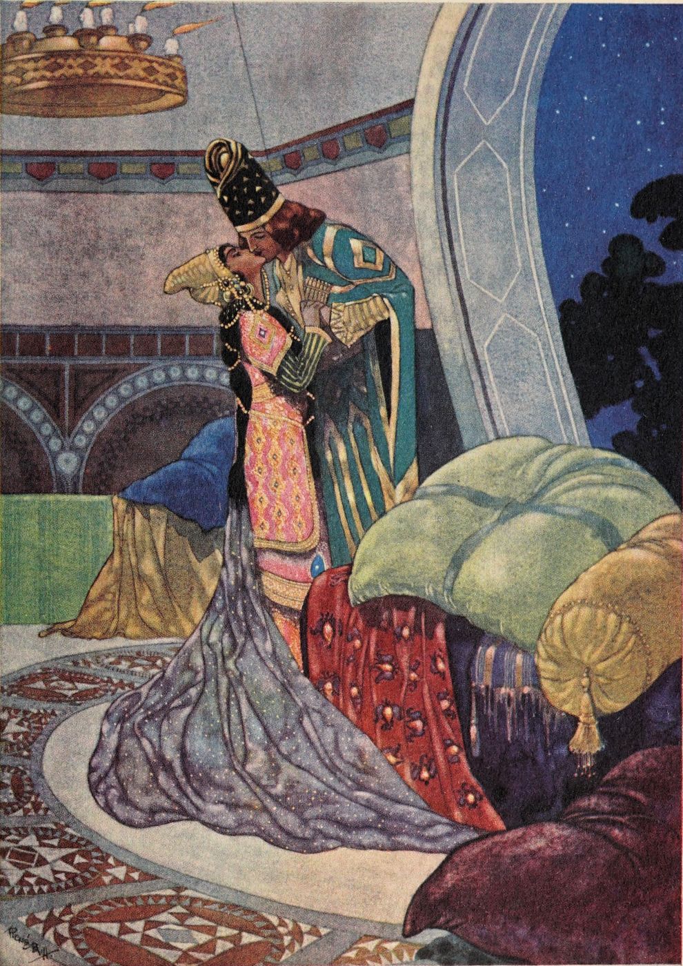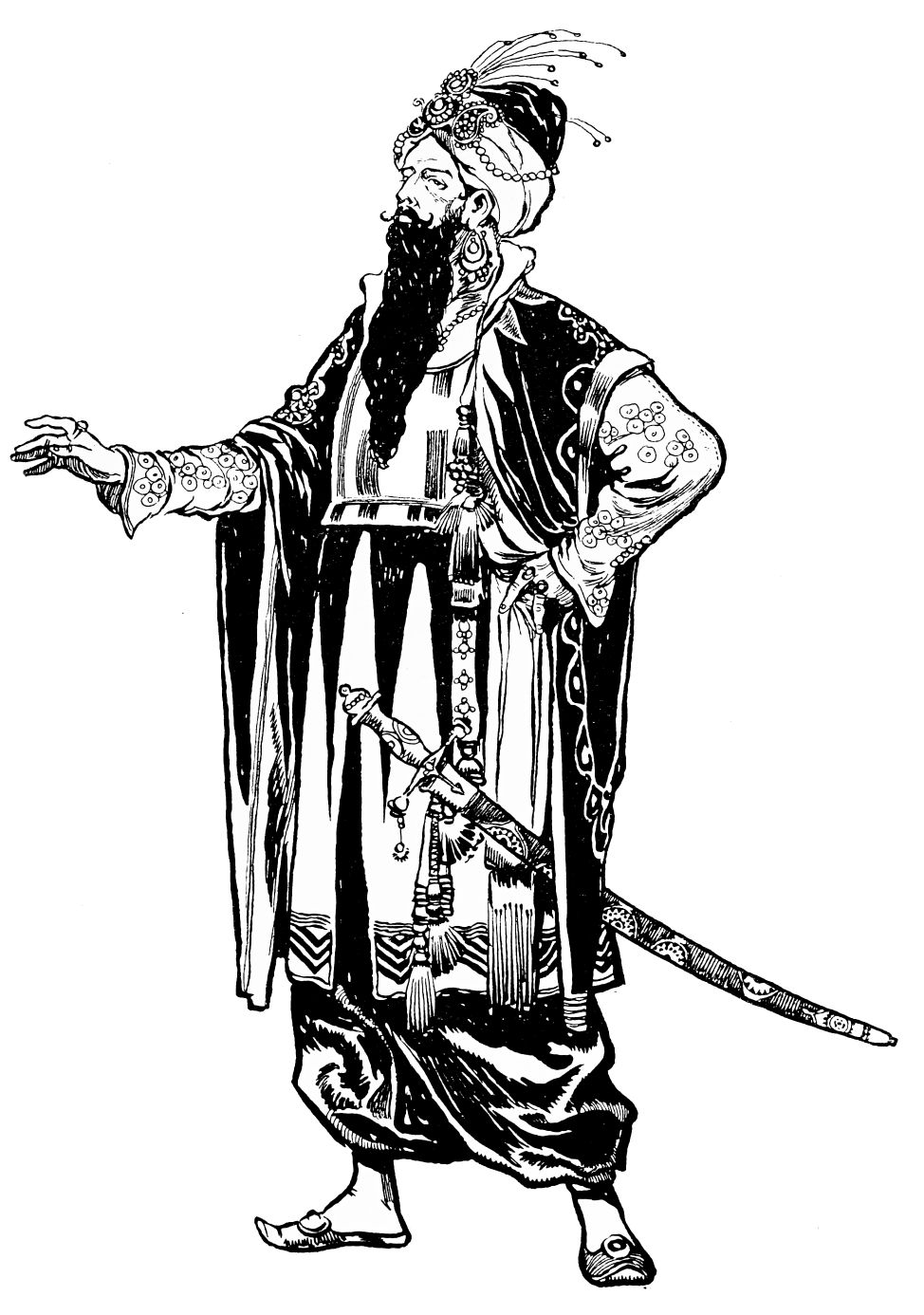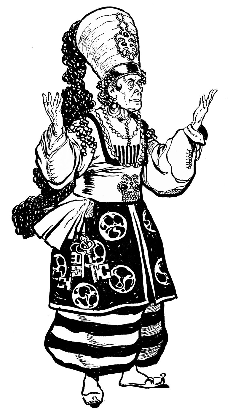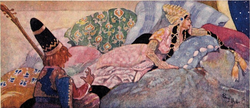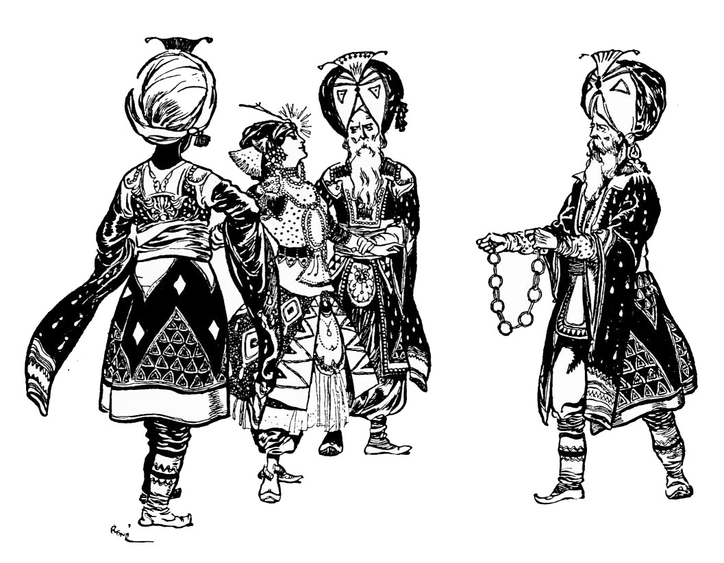 Orders are issued, but of these there scarce seems need, with such accustomed readiness do the Queen’s minions set about their tasks. Without ado the guards stationed at the doors prepare to sally forth, wrapping themselves in voluminous black cloaks. A subtle touch, those cloaks. They suggest the bleak, inhospitable wilderness without, emphasising the warmth and luxury of the brilliant scene within—an emphasis which is enhanced by the decorative value, considering the scene pictorially, of the black irregular masses which the shrouded high-capped figures present against the general riot of colour. When presently the stranger is led in, likewise cloaked and muffled, that contrast is again insisted upon. The stranger, it is instantly apparent, is travel-weary: one divines the curiosity and wonder with which he finds himself led into an atmosphere of ease and luxury which his tired senses, despite the bandage over his eyes, must gratefully apprehend.