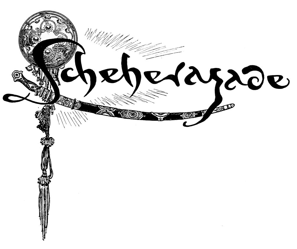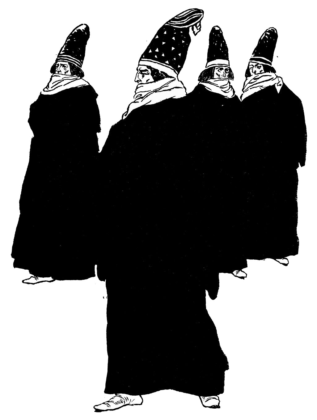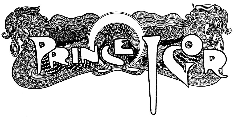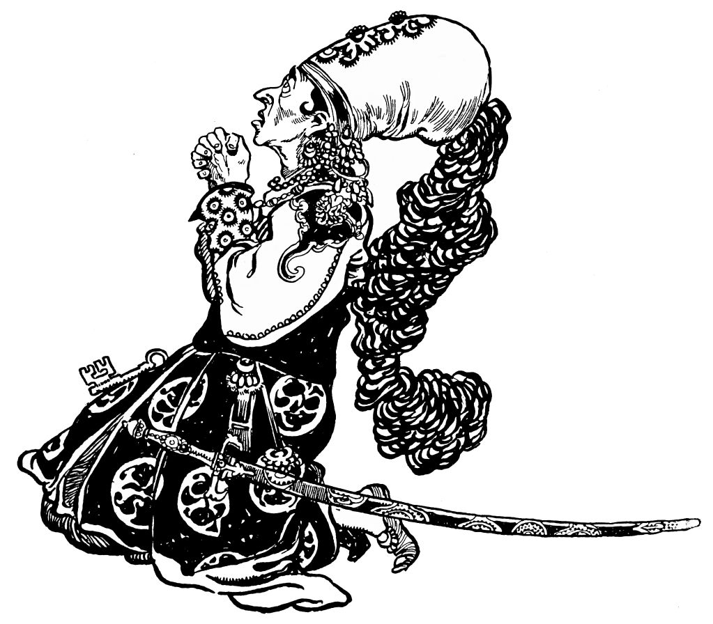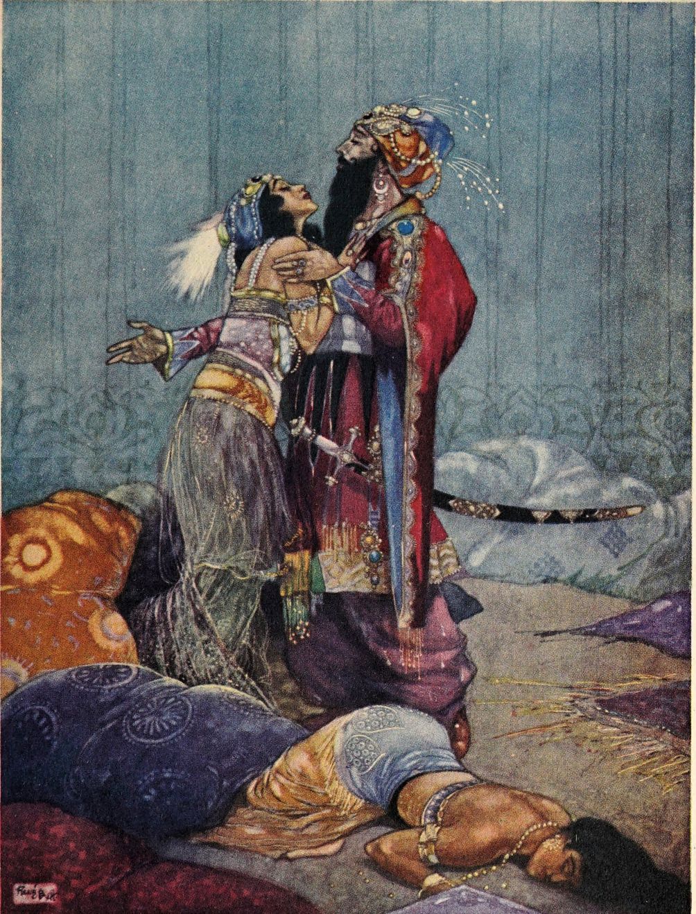Orders are issued, but of these there scarce seems need, with such accustomed readiness do the Queen’s minions set about their tasks. Without ado the guards stationed at the doors prepare to sally forth, wrapping themselves in voluminous black cloaks. A subtle touch, those cloaks. They suggest the bleak, inhospitable wilderness without, emphasising the warmth and luxury of the brilliant scene within—an emphasis which is enhanced by the decorative value, considering the scene pictorially, of the black irregular masses which the shrouded high-capped figures present against the general riot of colour. When presently the stranger is led in, likewise cloaked and muffled, that contrast is again insisted upon. The stranger, it is instantly apparent, is travel-weary: one divines the curiosity and wonder with which he finds himself led into an atmosphere of ease and luxury which his tired senses, despite the bandage over his eyes, must gratefully apprehend.