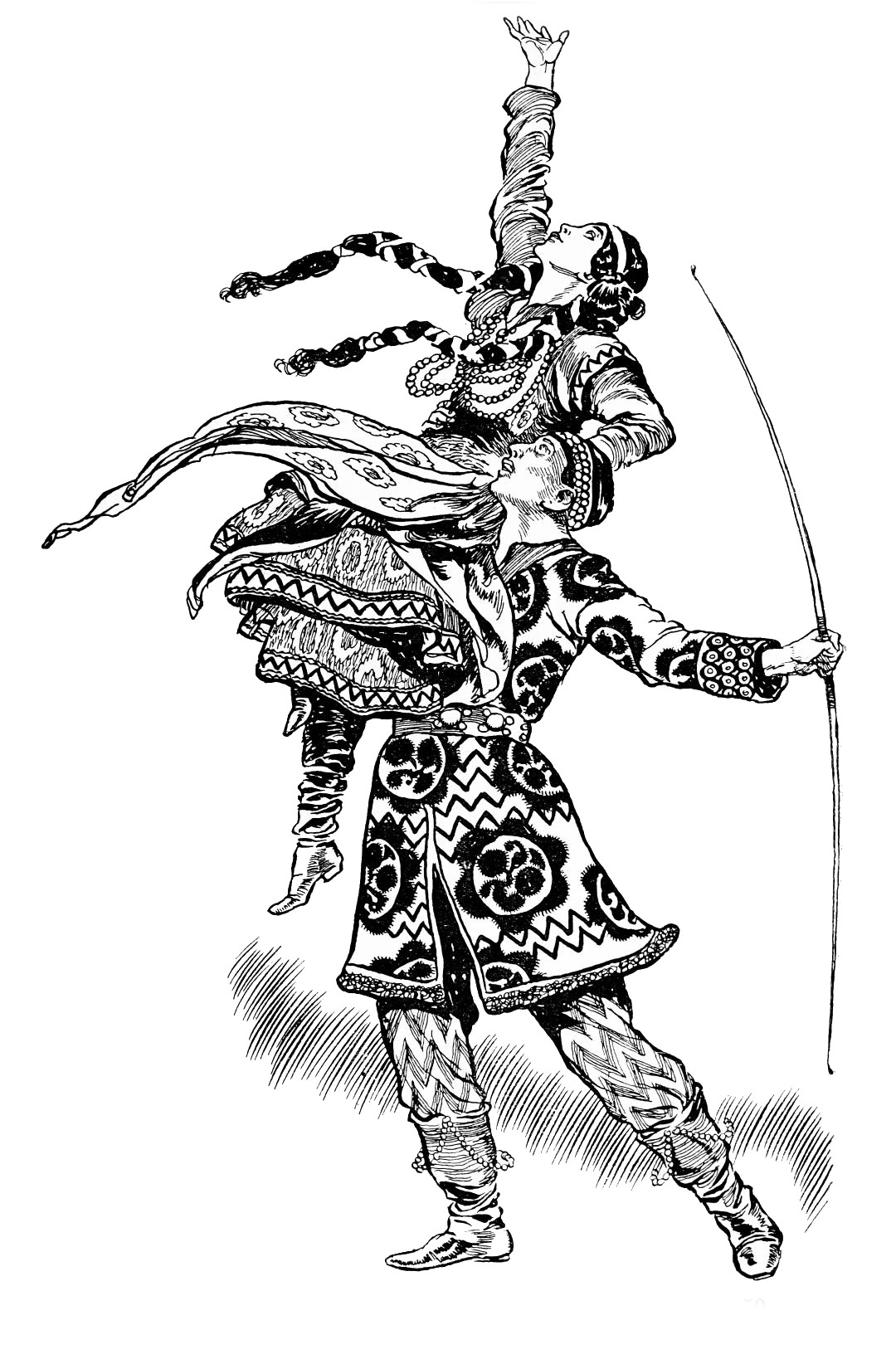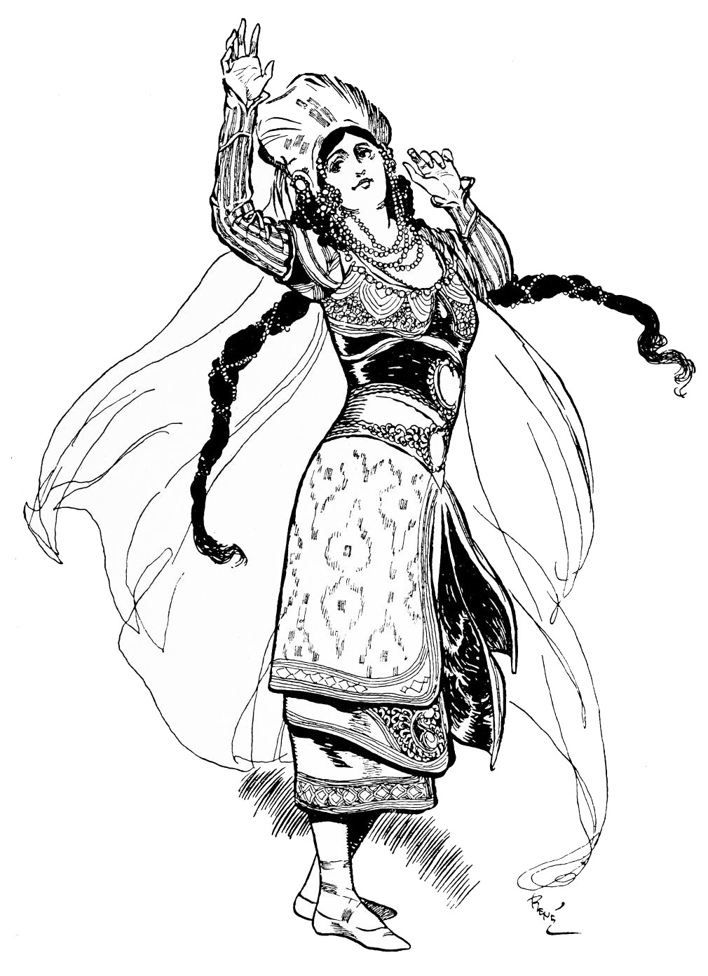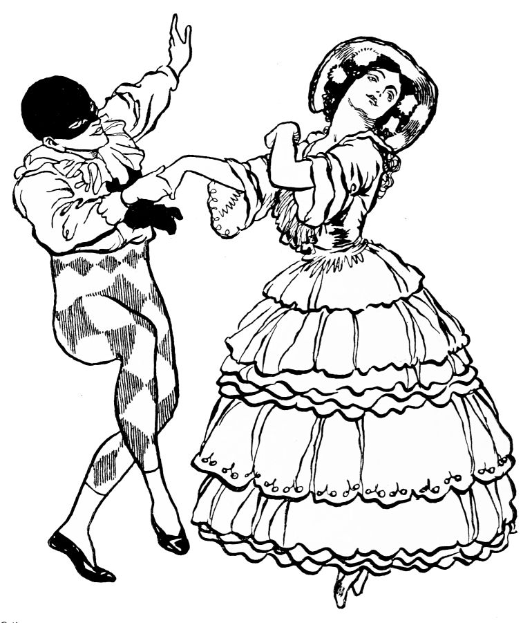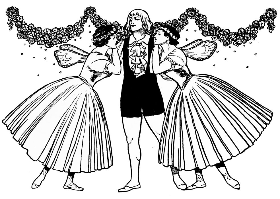 The eyes of the courtiers are turned upon him expectantly, for the Prince himself is an accomplished dancer, and the moment has arrived when he should entertain the company with his skill.{232} Fired by the ardour suppressed within him, he launches himself into a pas seul which astounds by its vigorous grace, measured agility, and brilliant daring of execution. At the very climax of his performance the beautiful stranger re-enters. Obedient to the Prince’s entreaty she dances once again; then joins him in the crowning intoxication of a pas de deux.