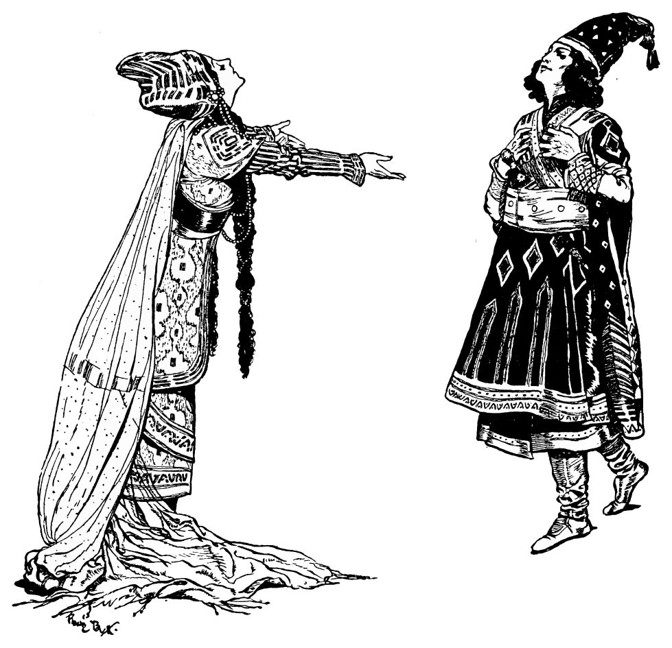 The vigour and impulse with which the Russian dancers showed that the ballet, as a means of artistic expression, could be endowed, Léon Bakst demonstrated could inspire the designing of scenery and costumes. Again one finds that a sense of unity and coherence has been the inspiration. Bakst’s broad method is the converse of the stage realist who seeks to counterfeit fact by a laborious building up of detail. He presents the essentials and little more, using colour rather than form to suggest the association of ideas which he wishes to produce. Compare the cool green setting of “Narcisse,” the violent riot of colour which forms a background to “Scheherazade,” the simplicity and dignity of the orange environment of “Cléopâtre,” with the fretful facsimiles of woodland grove, harem, and desert temple which a less original designer might have attempted. In his designs for costumes there is not less vigour and attack. While the conventional{9} “costumier” is drawing a fiddling fashion plate or draping a lay figure, Bakst is portraying not only the clothing which befits the temperament and character of the dramatis persona under consideration, but the very way in which that clothing would by such a one be worn or carried. Especially has he an eye for form and colour in movement—few of his designs for costumes show the wearers in repose—a fact which obviously gives his work a peculiar value for this particular purpose.