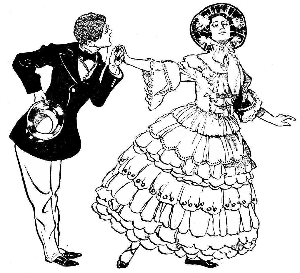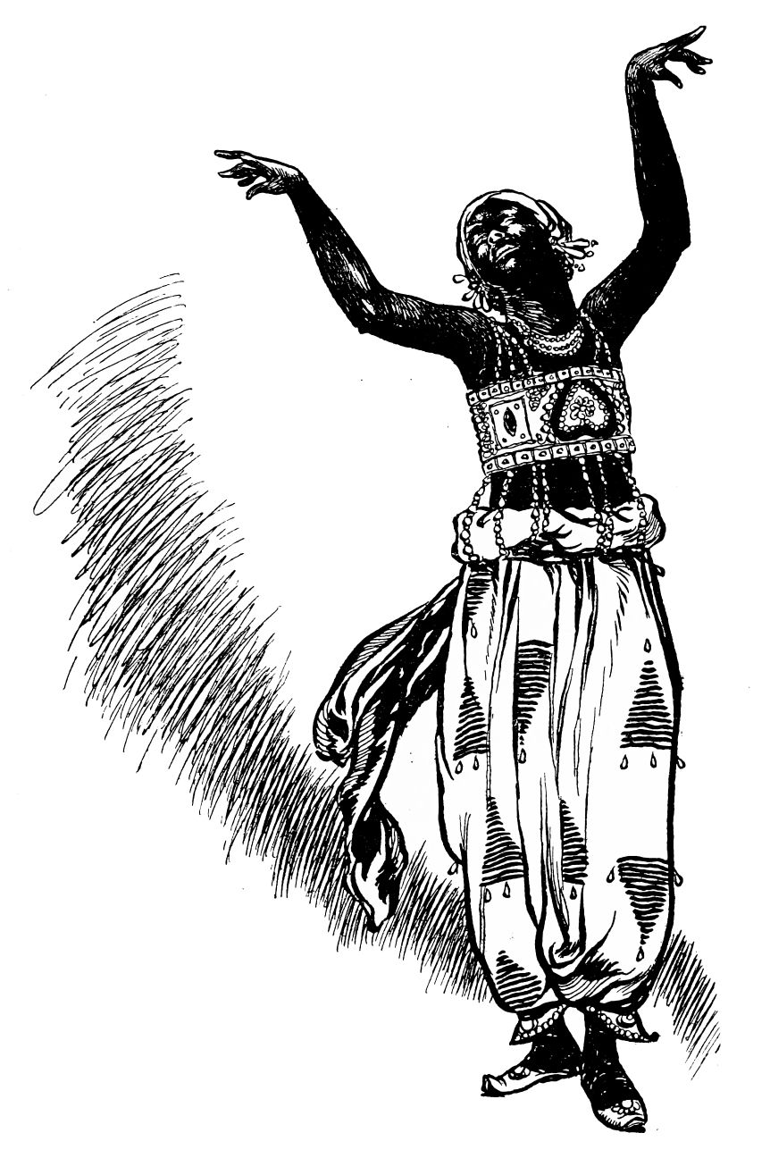 With sudden ardour the Blackamoor starts up, and flinging away his wretched plaything, seizes and embraces his fascinating visitor. The latter seems nothing loth, and gratified by this easy conquest the Blackamoor seats himself to receive the homage of a further dance. The lady, eager to make the most of opportunity, exerts herself in even livelier fashion than before, and finds occasion to{28} fall provocatively into her admirer’s arms. The Blackamoor is now entirely captivated, and when the Dancer begins, to a sugary, sentimental strain, a pas de fascination of which his sluggish wits at length realise himself to be the object, his fondness is grotesquely manifested. From the edge of his divan he fatuously ogles the fair one, and is thrown into transports of delight when she accepts a rapturous invitation to sit upon his knee.