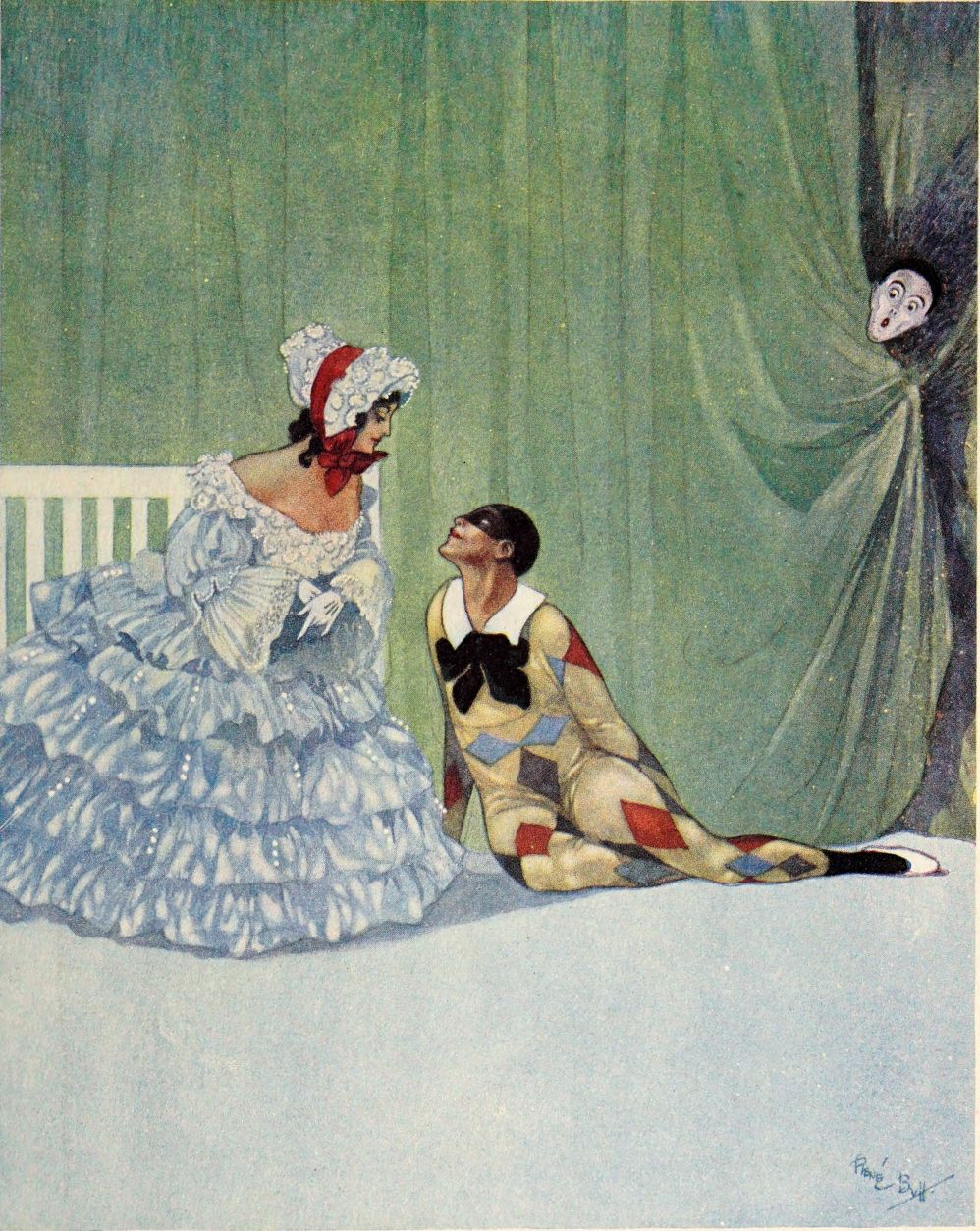 When drawn at length the curtains are, an engaging spectacle greets the eye. Propped in a row upon slender rods are three life-size puppet figures. In the middle is the Dancer, most radiant of dolls, with the pinkest of waxen cheeks and the glassiest of stares, elegantly arrayed in a striped jacket and pantaloons. On one side of her is the Blackamoor, a fierce and swarthy fellow, resplendent in green and gold, with gorgeous turban on his head; on the other, poor Pétrouchka, a grotesque figure of fun tricked out in glaring and fantastic motley.