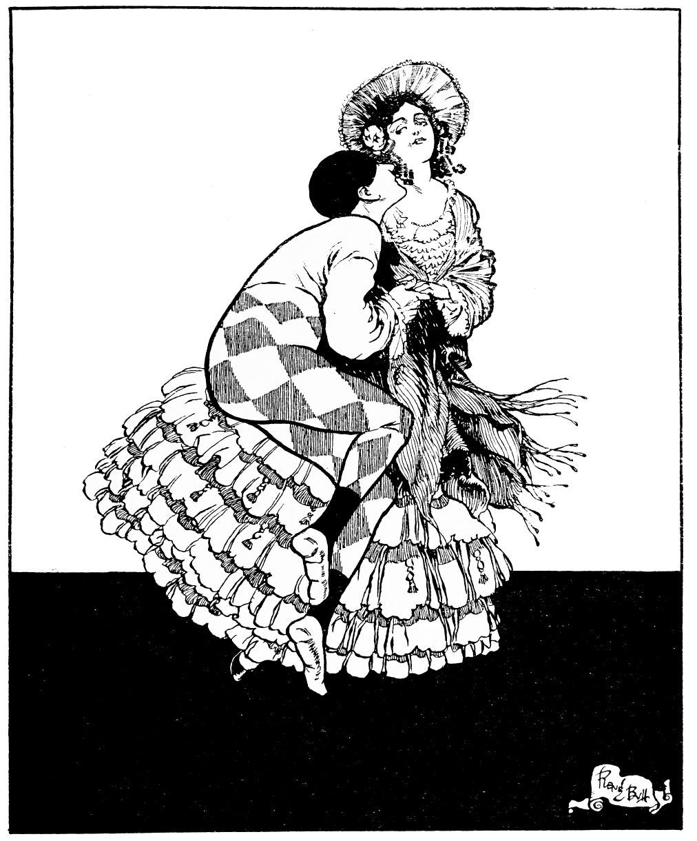 Pavlova is at her best (inevitably) when limited to the true functions of her art. As with Nijinsky, the dance is her proper medium of expression, though perhaps not so wholly. In some of her performances she displays a facile power of extrinsic gesture suggestive of qualities as mime which whet the desire to see her in dramatic ballet. The distribution of her favours betwixt Pierrot and Harlequin, her jealous partners when she dances, as Columbine, in Drigo’s “Pas de Trois,” is inspired by coquetry as frivolous and mirthful as the airy gaiety which her nimble feet express. In “L’Automne Bacchanale” there is a passion and a fervour which owe something to the actress’ art as well as to the dancer’s. It may seem idle to attempt a discrimination between two things so nearly identical, but seeing the view so commonly held in this country of dancing—that it consists merely of the rhythmic movement of the limbs according to certain arbitrary rules, the greatest of dancers being no more than the exponent of a perfect technique—it is perhaps worth while to lay stress upon the part which temperament must play.{240}