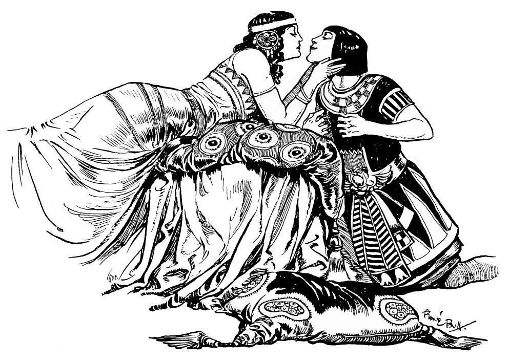 The woman looks again at the distant scene; then turns to another with a whispered word. At the movement heads are turned, figures that seemed indolent lose their sloth. Something is toward; the whispers are pregnant with meaning. Thamar alone, recumbent on her couch, gives no sign of life. One might suppose she slumbered, but for the cat-like swiftness with which, at a word from one of her attendants, she turns towards the window. Half raising herself, as a stalking leopard lifts shoulders and neck to watch its distant prey, she takes a wisp of gauze from her pillow and slowly waves it above her head. A stranger, errant among the lonely mountain sides, has espied the castle, and approaches. Even now he stands below the walls gazing at the fateful casement. Twice and again the seductive signal is repeated. Its purpose then appears to be achieved, for the scarf is dropped and Thamar, springing from the couch, turns to her expectant court.{42}