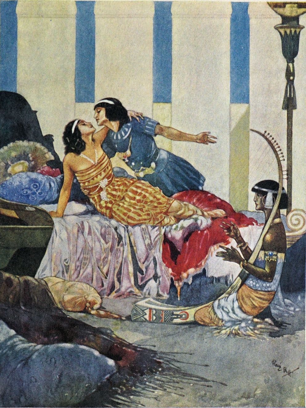 The master hand of Léon Bakst has designed nothing more startling and impressive than the great chamber of the castle in which Queen Thamar holds perpetual court. By some wondrous trick of{39}