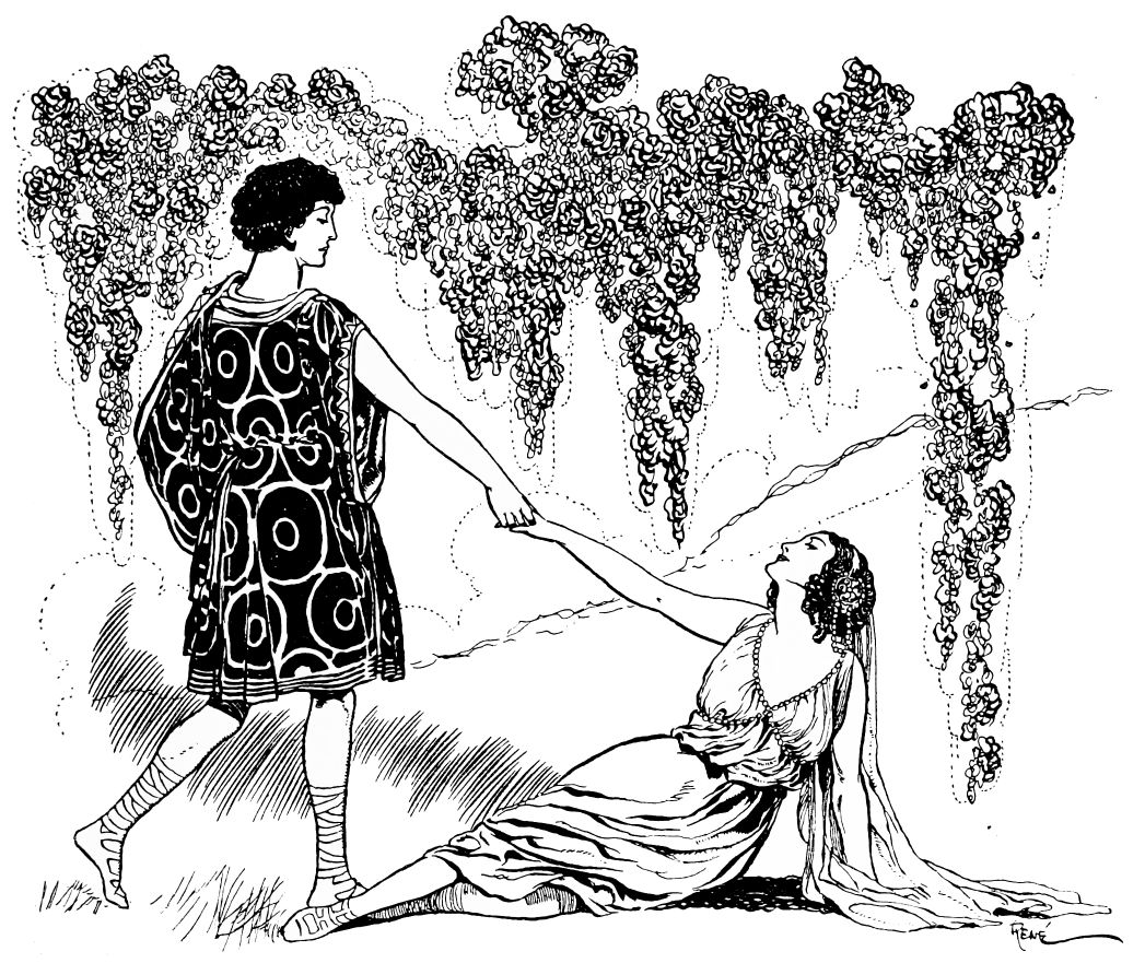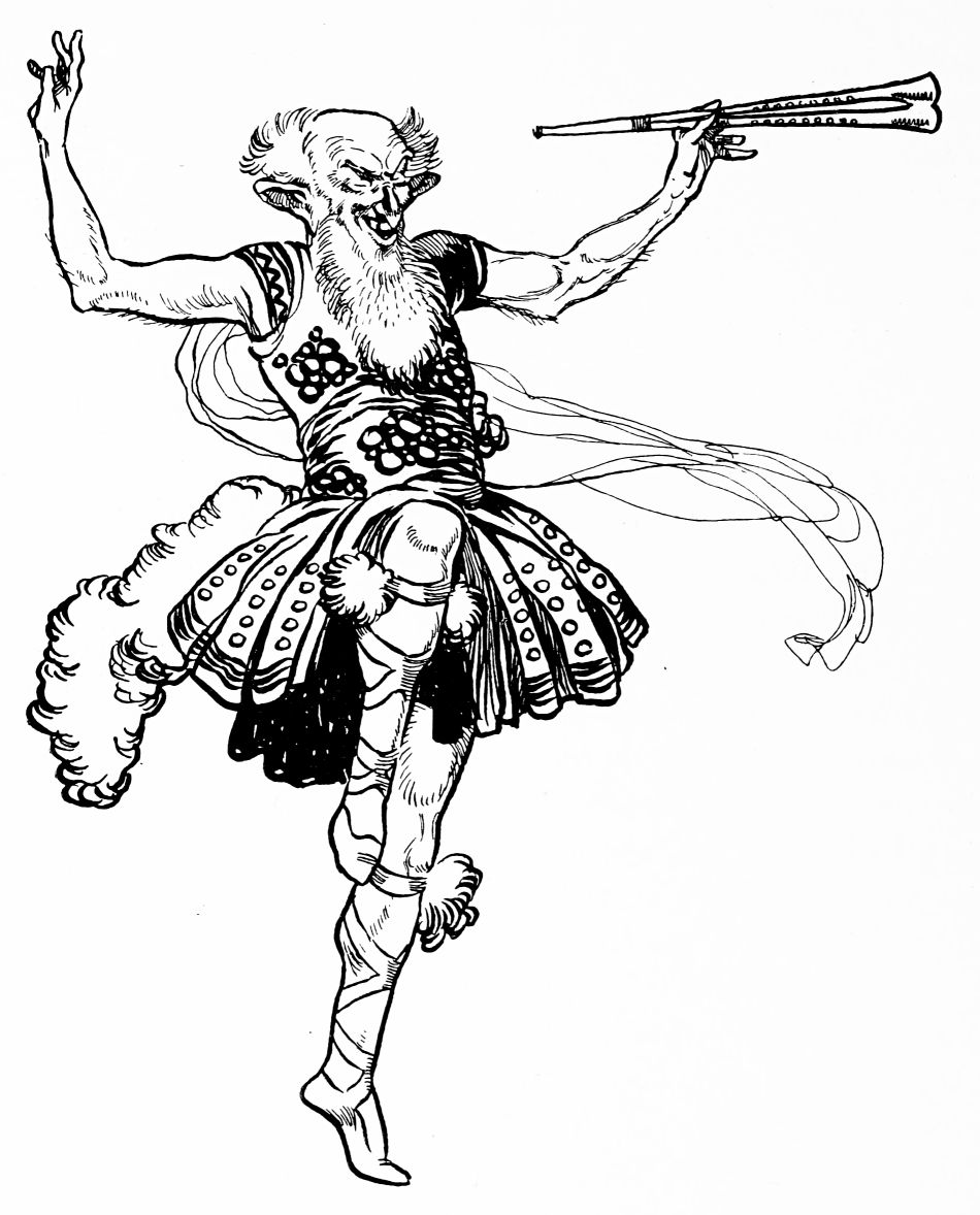 The keen animal senses of the faun detect some strange presence near at hand, and peering from his coign of vantage he perceives the nymphs. Such beings are beyond his ken, but the sight of them awakens a vague interest. He yields to a subtle attraction, and descending from his perch approaches the intruders.{185}