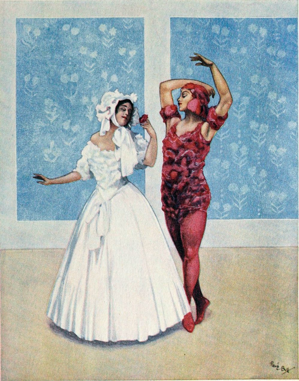 Momentarily Pétrouchka’s gloom is lightened by the unexpected advent of the Dancer, come upon a visit to the apartment of her love-sick swain. At sight of her Pétrouchkas fears and doubts are dissipated on the instant. No deepening of the rosy patches on her cheeks encourages the extravagant demonstration of delight with which he greets her; nor does even a momentary softening relax the fixity of her stare. But Pétrouchka, poor fool! takes no