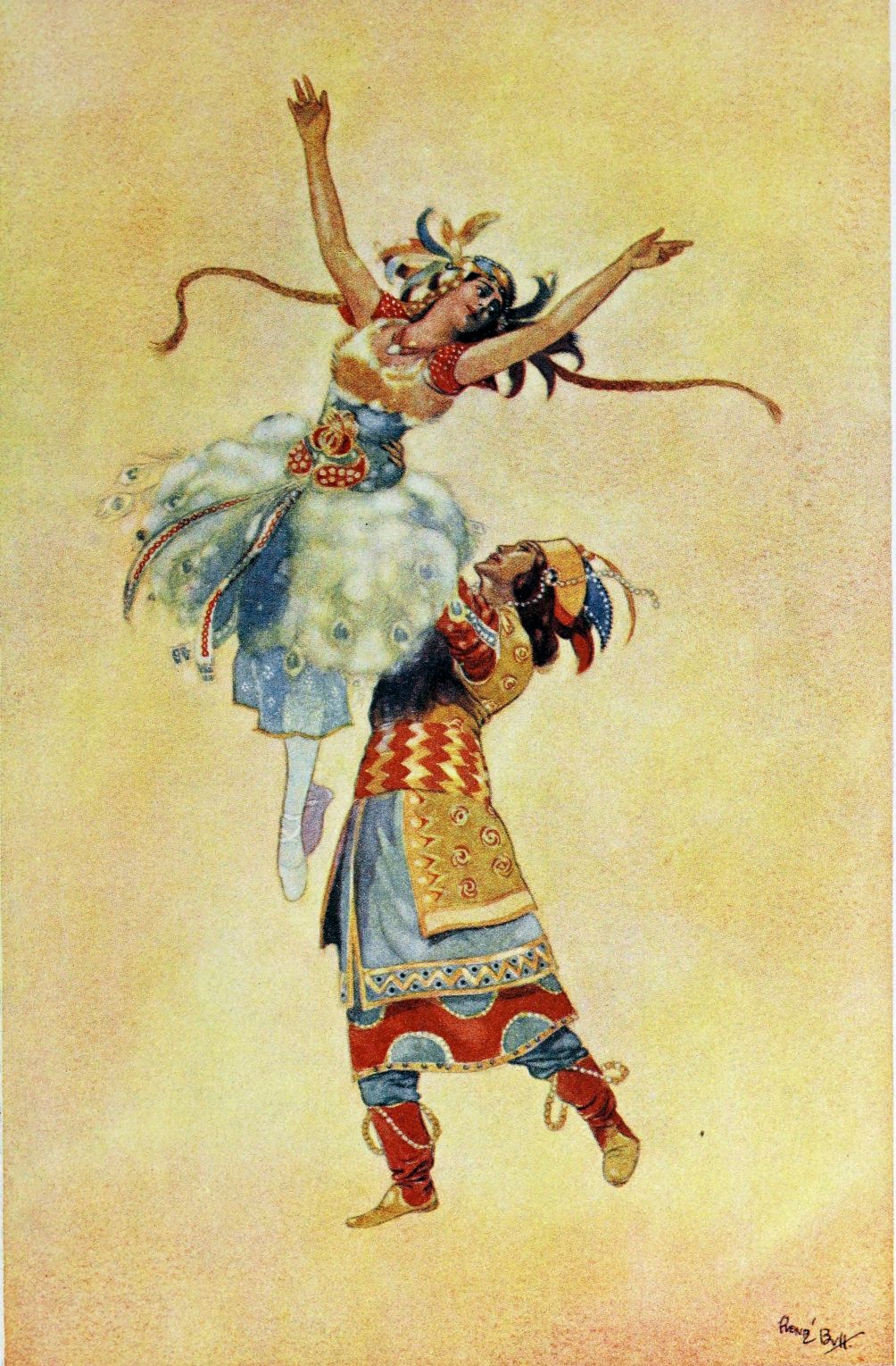 It will be readily appreciated how vital a bearing the designs of Léon Bakst have upon that ensemble which has been so strongly emphasised as the outstanding feature, and the fundamental secret, of the Russian Ballet’s success. But it should be remembered that Bakst’s creations as seen upon the stage fall short by a good deal of what they really are. It is inevitable, unfortunately, that this should be so. It is no easy task for the actual scene painter to reproduce upon a large scale the artist’s design with that absolute fidelity to colour and tone which alone can do it proper justice: and that the wearers of the costumes should be able to sustain without relapse their impersonations of the characters so vividly depicted in essentials by the artist’s brush and pencil is more than can reasonably be expected from even the most accomplished corps de ballet. How much the designs of Léon Bakst suffer in translation, only those who have seen the wonderful originals can realise.