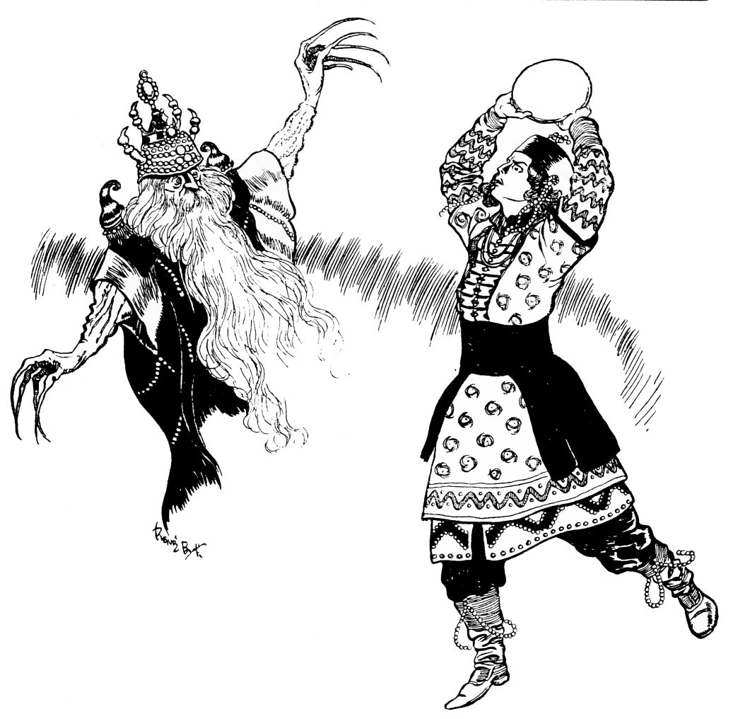 Standing unobtrusively at one side, the evil genie (for the Queen Swan’s escort is, of course, none other) watches from beneath his disguise the consummation of his wicked plan. With every attention that opportunity allows him to offer to the stranger, the Prince’s newly-fanned passion burns more ardently. And as with him, so with the luckless Swan-maiden. The dance but serves to melt the last icicle of her discretion, and when the Prince, remembering suddenly their situation, conscious of the gaze of all the court, would leave her and regain the composure he has lost, she holds and allures him with a beseeching look and gesture that is beyond resistance. Only when the dance is ended, and the Swan-maiden, herself awakening momentarily from her all but trance, retires hastily from the apartment, does the Prince resume command of himself.