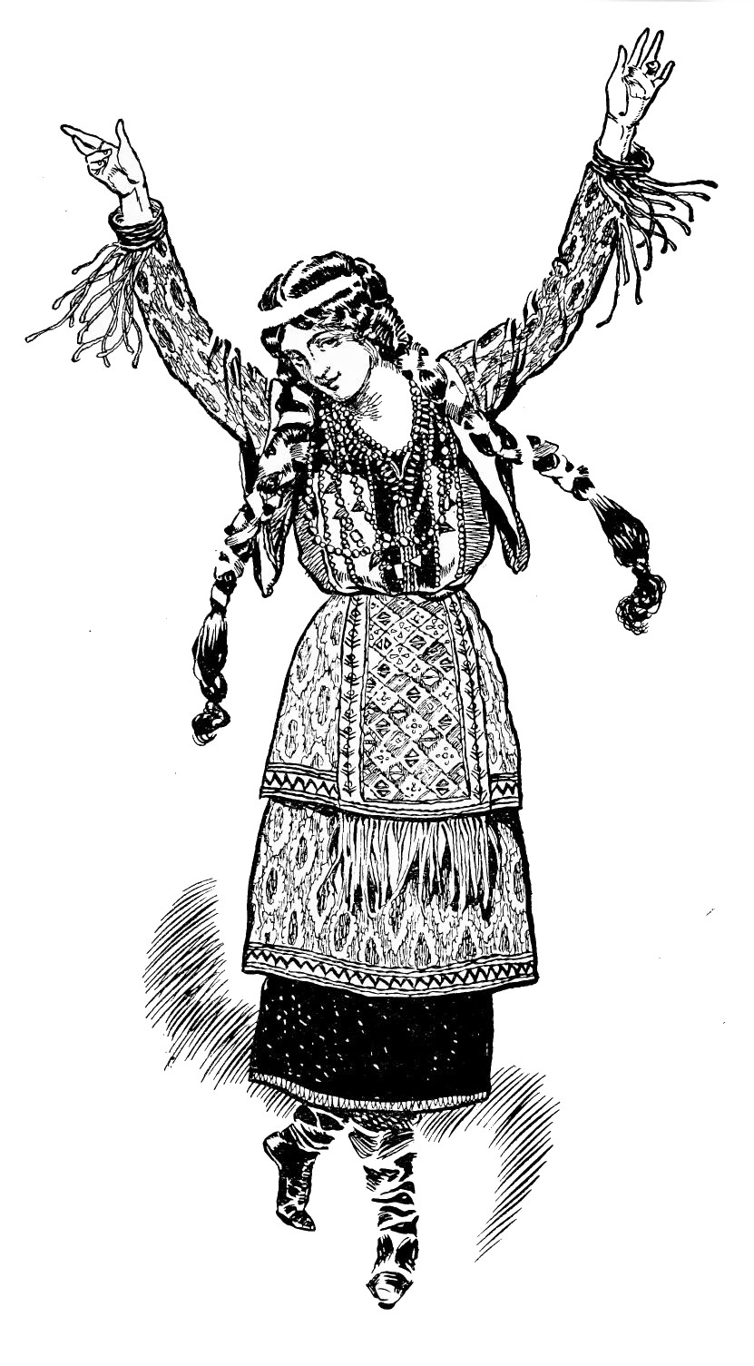 Some coachmen, challenging each other to feats of agility, break into a dance. The crowd stays to watch them, paying but little attention to the frequent appeals for patronage of an old man stationed on the top of a booth, who beseeches consideration of his astonishingly lengthy beard. More likely to attract the eye are the{19} pair of handsome gipsy girls who join him on his elevated platform. But it is not until the coachmen pause for breath in their vigorous saltations that the sirens overhead succeed in fastening their allurements upon a festive and inebriated merchant who has pushed his way, with uncertain gait, to the front.