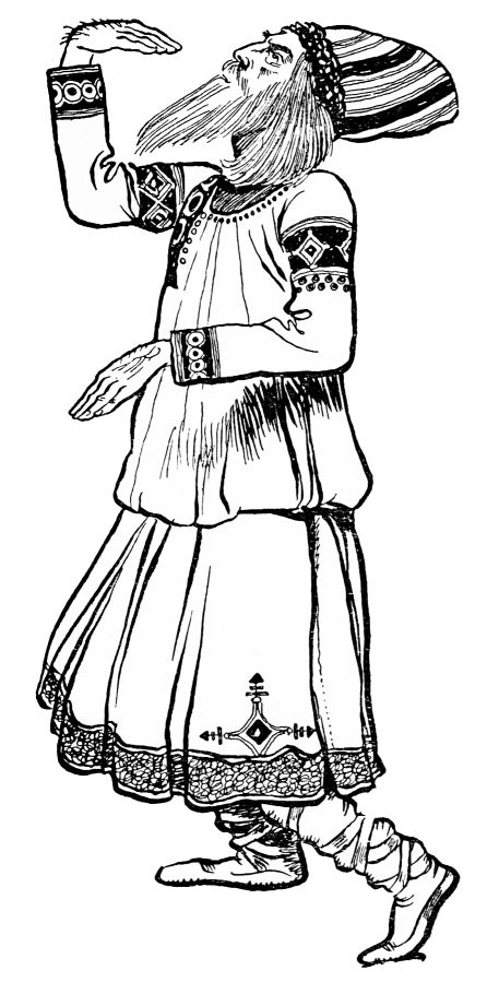 The first act shows the Adoration of the Earth. The joy of humankind in the advent of spring finds expression in the dance, and in the performance of due rites, in the ceremony of uniting the Sire of all the Sages to the newly fecund earth. What actually happens is that sundry groups of persons, attired in picturesque but by no means prehistoric garb, are discovered prostrating themselves in various peculiar poses amidst an expansive landscape which is very green, but not much else. One group, under the instruction of “an old woman of 300 years,” begins a ceremonial dance, which is to say that the younger members stamp{203} their feet and jerk their bodies about in an odd, rhythmic fashion, while the triple centenarian hops spasmodically amongst them. Other groups in turn spring up from their postures of obeisance and do the same, with variations. A number of young girls enter, and join the young men in the performance of the rites ordained. One is to understand that the strange antics which ensue are the primitive types of those folk dances and games which peasant children perform to this day in Russia: but it is doubtful whether even to a spectator familiar with modern rustic life in the remotest parts of that country, the connection would be apparent between the traditional games of feast days and the eccentric contortions of the performers on the stage. A feature of the games, the only one definitely recognisable (because the only one specified in the printed synopsis of the ballet) is a simulated abduction of some of the girls by a number of the young men, which is premonitory of the sacrifice to Iarilo, god of light—i.e., the Sun—depicted in the second act.
