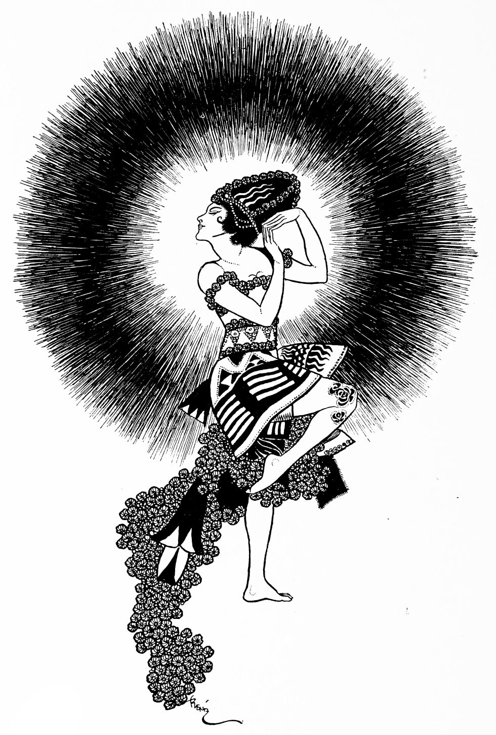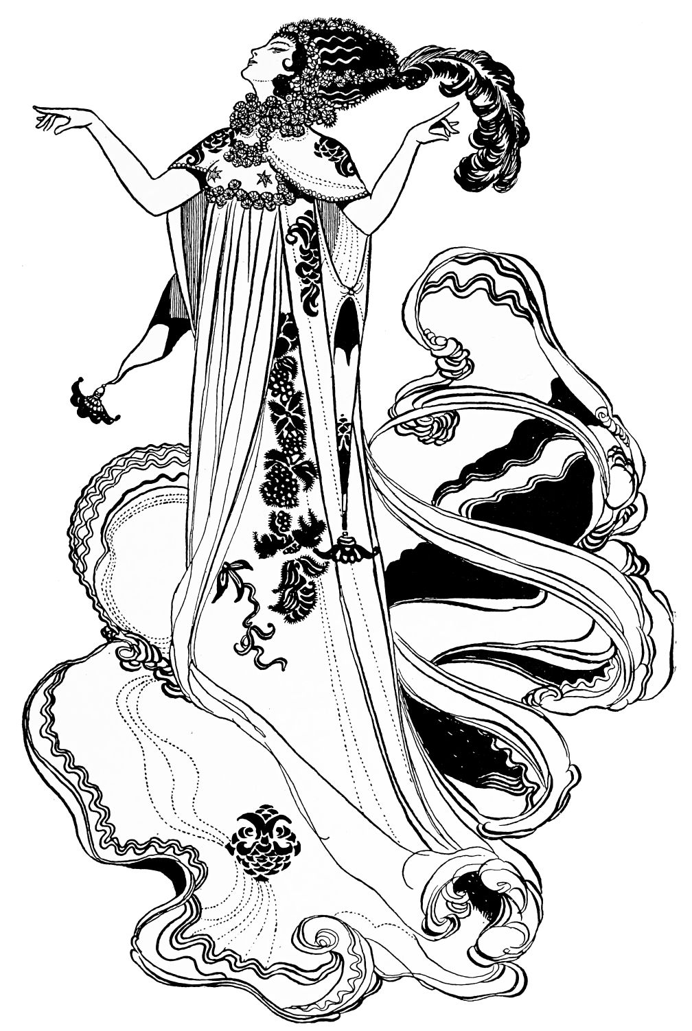 Regard Beardsley’s drawings as fashion plates, and the reader will arrive at a very fair idea of Karsavina’s appearance as Salome. Her costume is exiguous—even allowing for the lace-edged undergarment which appears round one thigh but not round the other. Her legs and arms are bare, but with a blood red heart and other devices stencilled on them. A high head-dress surmounts the tiny{220}