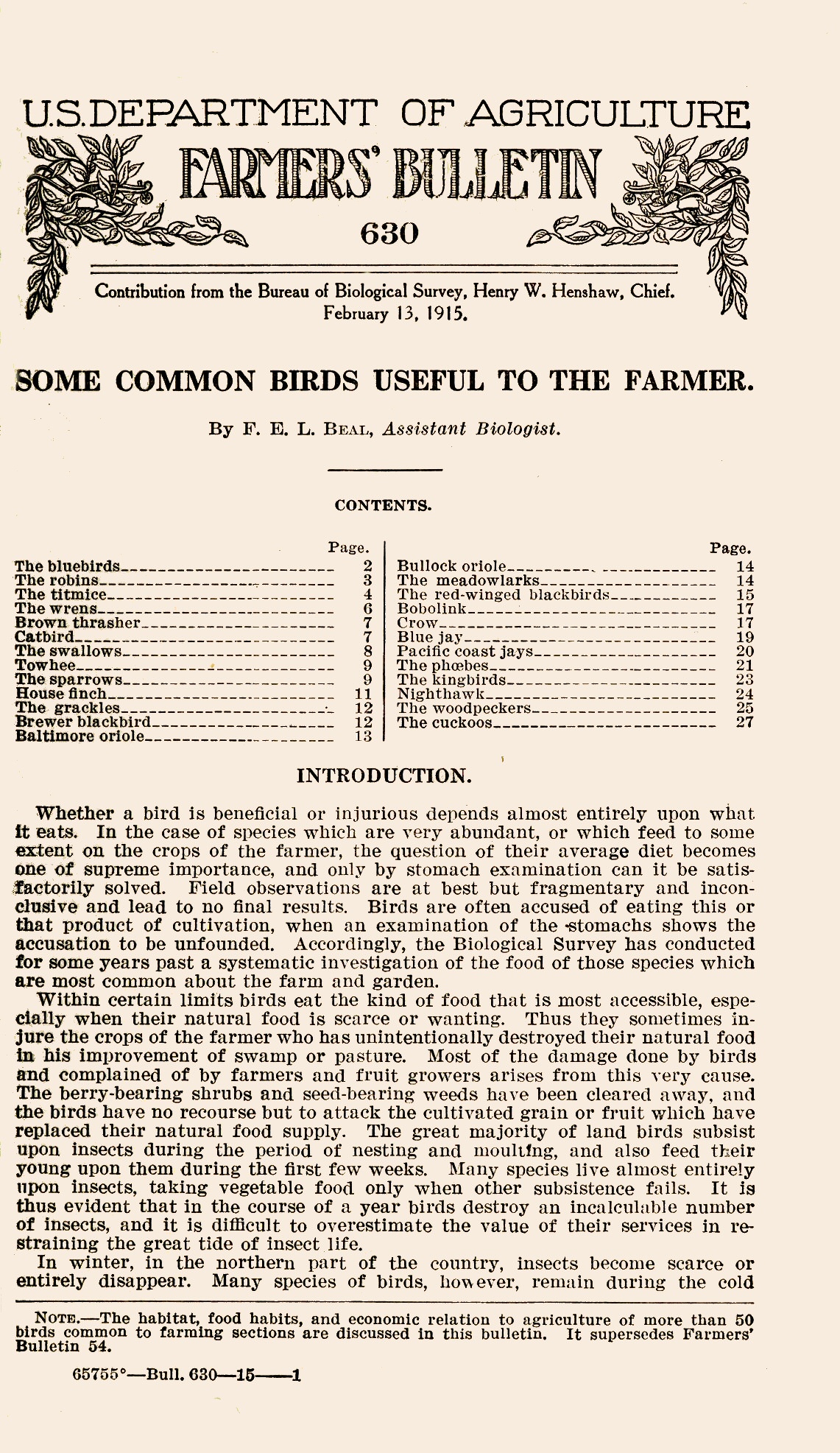 Note.—The habitat, food habits, and economic relation to agriculture of more than 50 birds common to farming sections are discussed in this bulletin. It supersedes Farmers’ Bulletin 54.