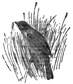 The red-winged or swamp blackbird[41] in its various forms (fig. 14) is found all over the United States and the region immediately to the north. While « 16 » common in most of its range, its distribution is more or less local, mainly on account of its partiality for marshes. It builds its nest over or near standing water, in tall grass, rushes, or bushes. Owing to this peculiarity the bird may be absent from large tracts of country which afford no swamps or marshes suitable for nesting. It usually breeds in large colonies, though single families, consisting of a male and several females, may sometimes be found in a small slough, where each female builds her nest and rears her own little brood, while her liege lord displays his brilliant colors and struts in the sunshine. In the upper Mississippi Valley the species finds most favorable conditions, for the countless prairie sloughs and the margins of the numerous shallow lakes afford nesting sites for thousands of red-wings; and here are bred the immense flocks which sometimes do so much damage to the grain fields of the West. After the breeding season the birds congregate preparatory to migration, and remain thus associated throughout the winter.